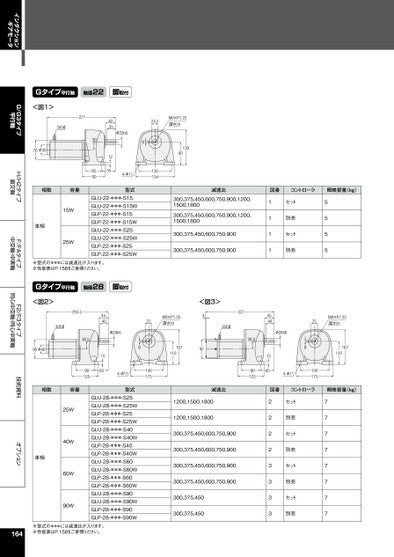 インダクションギアモータG/G3タイプ平行軸H/H2タイプ直交軸F/FAタイプ中空軸・中実軸F2/F3タイプ同心中空軸・同心中実軸技術資料オプション40351255306590φ22h6624.5M8×P1.25深さ20139901301544-φ11型式減速比図番コントローラ概略質量(kg)Gタイプ平行軸軸径22脚取付271300ℓ<図1>φ4076相数容量単相15W25WGLU-22-***-S15GLU-22-***-S15WGLP-22-***-S15GLP-22-***-S15WGLU-22-***-S25GLU-22-***-S25WGLP-22-***-S25GLP-22-***-S25W300,375,450,600,750,900,1200,1500,1800300,375,450,600,750,900,1200,1500,1800300,375,450,600,750,900300,375,450,600,750,900※型式の***には減速比が入ります。※性能表はP.158をご参照ください。Gタイプ平行軸軸径28脚取付<図2>293.5300ℓ90φ404540156536.590125φ28h631M8×P1.25深さ2081671104-φ11140175327300ℓ<図3>49236.590125111145401565セット別売セット別売5555φ28h631M8×P1.25深さ2081671104-φ11140175相数容量型式減速比図番コントローラ概略質量(kg)単相25W40W60W90WGLU-28-***-S25GLU-28-***-S25WGLP-28-***-S25GLP-28-***-S25WGLU-28-***-S40GLU-28-***-S40WGLP-28-***-S40GLP-28-***-S40WGLU-28-***-S60GLU-28-***-S60WGLP-28-***-S60GLP-28-***-S60WGLU-28-***-S90GLU-28-***-S90WGLP-28-***-S90GLP-28-***-S90W※型式の***には減速比が入ります。※性能表はP.158をご参照ください。1641200,1500,18001200,1500,1800300,375,450,600,750,900300,375,450,600,750,900300,375,450,600,750,900300,375,450,600,750,900300,375,450300,375,45022223333セット別売セット別売セット別売セット別売77777777