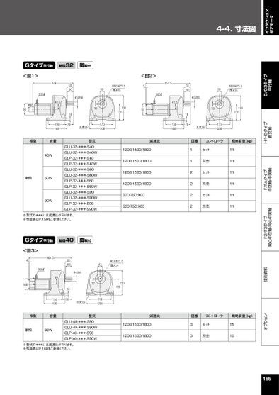 インダクションギアモータ4-4.寸法図オプション技術資料F2/F3タイプ同心中空軸・同心中実軸F/FAタイプ中空軸・中実軸H/H2タイプ直交軸G/G3タイプ平行軸Gタイプ平行軸軸径32脚取付<図1>φ4090324300ℓ41.513016855501870<図2>φ32h635M10×P1.5深さ25101981304924-φ13170208357.5300ℓ5550187041.5130168φ32h635M10×P1.5深さ25101981304-φ13170208相数容量型式減速比図番コントローラ概略質量(kg)40W単相60W90WGLU-32-***-S40GLU-32-***-S40WGLP-32-***-S40GLP-32-***-S40WGLU-32-***-S60GLU-32-***-S60WGLP-32-***-S60GLP-32-***-S60WGLU-32-***-S90GLU-32-***-S90WGLP-32-***-S90GLP-32-***-S90W※型式の***には減速比が入ります。※性能表はP.159をご参照ください。1200,1500,18001200,1500,18001200,1500,18001200,1500,1800600,750,900600,750,900112222セット別売セット別売セット別売111111111111Gタイプ平行軸軸径40脚取付<図3>4108401.5300ℓ4915019665602090φ40h643M10×P1.5深さ25122301504-φ15210254相数容量型式減速比図番コントローラ概略質量(kg)単相90WGLU-40-***-S90GLU-40-***-S90WGLP-40-***-S90GLP-40-***-S90W※型式の***には減速比が入ります。※性能表はP.160をご参照ください。1200,1500,18001200,1500,180033セット別売1515165