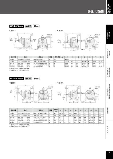 インダクションギアモータ5-2.寸法図オプション技術資料F2/F3タイプ同心中空軸・同心中実軸F/FAタイプ中空軸・中実軸H/H2タイプ直交軸G/G3タイプ平行軸17531M8×P1.25深さ20φ28h68167110±0.4-φ11140175DE―φ12h6φ15h6φ20h6―456F―13.51722.5G―65.58089.545401565CA23.5G90125CBFED86.5<図2>概略質量(kg)AB6.55.566276.5220.5235244.5―253035―222732G3タイプ平行軸軸径28脚取付<図1>13.5φ12h641142522A454031M8×P1.25深さ204φ28h68121.59012515654-φ11140175171.5167110±0.2相当容量0.1kW0.2kW0.4kW0.75kW型式G3L-28-***-010G3L-28-***-020G3L-28-***-040G3L-28-***-075※型式の***には減速比が入ります。※性能表はP.172をご参照ください。減速比300,375,450100,120,160,20030,40,50,60,80,1005,10,15,20,25図番1222G3タイプ平行軸軸径32脚取付5550187035M10×P1.25深さ25φ32h610198130±0.24-φ13170208A28.5FEG101.5IH<図4>35M10×P1.5深さ25φ32h610198130±0.24-φ13170208D130168<図3>252213.5φ12h64CABD13016855501870相当容量型式減速比図番0.1kW0.2kW0.4kW0.75kW1.5kWG3L-32-***-010G3L-32-***-020G3L-32-***-040G3L-32-***-075G3L-32-***-150※型式の***には減速比が入ります。※性能表はP.172をご参照ください。600,750,900,1200300,375,450100,120,160,20030,40,50,60,80,1005,10,15,20,2533444概略質量(kg)9.59.599.510ABCDEFGHI295.5315.5254273.5297-15.5―――129135.5―――95.5115.55473.597――303540――273235――φ15h6φ20h6φ25h6――568――1722.528