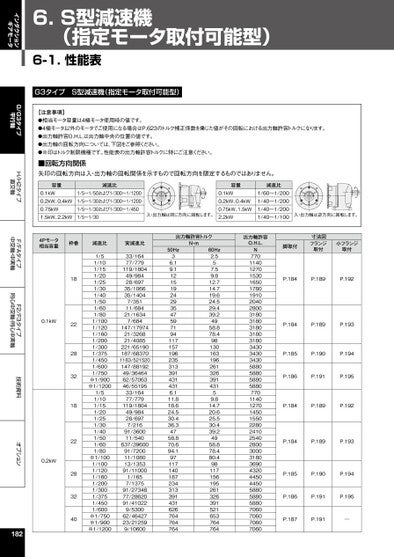 インダクションギアモータG/G3タイプ平行軸H/H2タイプ直交軸F/FAタイプ中空軸・中実軸F2/F3タイプ同心中空軸・同心中実軸技術資料オプション6.S型減速機(指定モータ取付可能型)6-1.性能表G3タイプS型減速機(指定モータ取付可能型)【注意事項】●相当モータ容量は4極モータ使用時の値です。●4極モータ以外のモータでご使用になる場合はP.623のトルク補正係数を乗じた値がその回転における出力軸許容トルクになります。●出力軸許容O.H.L.は出力軸中央の位置の値です。●出力軸の回転方向については、下図をご参照ください。●※印はトルク制限機種です。性能表の出力軸許容トルクに特にご注意ください。■回転方向関係矢印の回転方向は入・出力軸の回転関係を示すもので回転方向を限定するものではありません。容量減速比0.1kW0.2kW、0.4kW0.75kW1.5kW、2.2kW1/5~1/50および1/300~1/12001/5~1/30および1/300~1/12001/5~1/30および1/300~1/4501/5~1/304Pモータ相当容量枠番減速比実減速比出力軸許容トルクN・m容量0.1kW0.2kW、0.4kW0.75kW、1.5kW2.2kW減速比1/60~1/2001/40~1/2001/40~1/2001/40~1/100入・出力軸は逆方向に回転します。入・出力軸は同じ方向に回転します。1/51/101/151/201/251/301/401/501/601/801/1001/1201/1601/2001/3001/3751/4501/6001/7501/51/101/151/201/251/301/401/501/601/80※1/900※1/1200※1/1001/1001/1201/1601/2001/3001/3751/4501/600※1/750※1/900※1/120033/16477/779119/180449/98428/69735/106635/14047/35111/68421/16347/684147/1797421/326821/4085221/65190187/683701183/521520147/8819249/3646462/5706346/5519533/16477/779119/180449/98428/6977/21691/360011/540637/3960091/720011/108013/135391/110001/1657/137591/2734877/2862091/410229/530062/4642723/212599/106000.1kW0.2kW18222832182228324018250Hz36.19.1121519242935475971941171571962353133914314316.111.818.624.530.436.34758.870.694.197117140187234313391431626764764764出力軸許容O.H.L.N77011401270153016501780191020402800318031803180318031803430343034305880588058805880770114012701450155022802410254028003000318036904320445044505880588058807060706070607060脚取付寸法図フランジ取付小フランジ取付P.184P.189P.192P.184P.189P.193P.185P.190P.194P.186P.191P.195P.184P.189P.192P.184P.189P.193P.185P.190P.194P.186P.191P.195P.187P.191―60Hz2.557.59.812.714.719.624.529.439.24958.878.49813016319626132639143159.814.720.625.530.439.24958.878.480.498117156195261326391521653764764