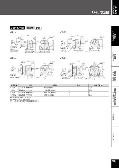 インダクションギアモータ6-2.寸法図オプション技術資料F2/F3タイプ同心中空軸・同心中実軸F/FAタイプ中空軸・中実軸H/H2タイプ直交軸G/G3タイプ平行軸G3タイプ平行軸軸径28脚取付<図1>510φ110G7φ130φ160φ11H7深さ33(基準□面)S4-M8×P1.25深さ11(カンツウ)<図3>516Sφ110G7φ130φ160φ14F7深さ36(基準□面)S4-M8×P1.25深さ204φ28h681565901254-φ11140175194167110±0.2205.54.5454031M8×P1.25深さ2023.5901251565φ28h68167110±0.24-φ11140175相当容量0.1kW0.2kW0.4kW0.75kW型式G3LS-28-***-010G3LS-28-***-020G3LS-28-***-040G3LS-28-***-075※型式の***には減速比が入ります。※性能表はP.182をご参照ください。※モータ取り付け部詳細はP.625をご参照ください。減速比300,375,450100,120,160,20030,40,50,60,80,1005,10,15,20,252544.5S454031M8×P1.25深さ201984.5S<図2>510φ110G7φ130φ160φ11H7深さ33(基準□面)4-M8×P1.25深さ11(カンツウ)S<図4>621.5φ19F7深さ42(基準□面)S4.5Sφ130G7φ165φ2004-M10×P1.5深さ23(カンツウ)123423.590125209.523.590125図番31M8×P1.25深さ20167110±0.45401565φ28h684-φ111401753145401565φ28h684-φ11140175M8×P1.25深さ20186.5167110±0.213.5概略質量(kg)7.56.576.5185