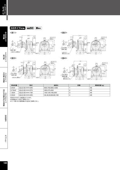 インダクションギアモータG/G3タイプ平行軸H/H2タイプ直交軸F/FAタイプ中空軸・中実軸F2/F3タイプ同心中空軸・同心中実軸技術資料オプション374.5φ2011757025φ50h61453.5M12×P1.75深さ30294265170±0.21602101004-φ18230290757025334φ2040160210図番53.5M12×P1.75深さ30φ50h614294265170±0.24-φ18230290概略質量(kg)48484848G3タイプ平行軸軸径50脚取付<図1>BC4.5Sφ110G7φ130φ160D(基準□面)S4-M8×P1.25深さ20<図3>4.5Sφ130G7φ165φ200827φ24F7深さ52(基準□面)S4-M10×P1.5深さ25360.5φ20E757025φ50h61453.5M12×P1.75深さ30294265170±0.21602101004-φ18230290321.5φ204016021075702510053.5M12×P1.75深さ30φ50h614294265170±0.24-φ18230290<図2>621.54.5Sφ130G7φ165φ200φ19F7深さ42(基準□面)S4-M10×P1.5深さ23(カンツウ)<図4>5S831φ180G7φ250φ28F7深さ62(基準□面)S4-M12×P1.75深さ16(カンツウ)相当容量0.4kW0.75kW1.5kW2.2kW型式G3LS-50-***-040G3LS-50-***-075G3LS-50-***-150G3LS-50-***-220※型式の***には減速比が入ります。※性能表はP.183をご参照ください。※モータ取り付け部詳細はP.625をご参照ください。減速比600,750,900,1200300,375,450100,120,160,20030,40,50,60,80,1001234188