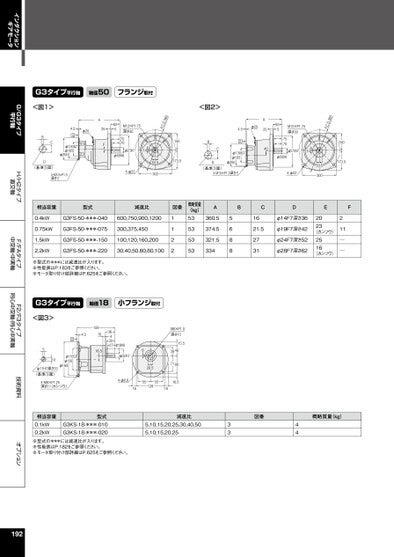 インダクションギアモータG/G3タイプ平行軸H/H2タイプ直交軸F/FAタイプ中空軸・中実軸F2/F3タイプ同心中空軸・同心中実軸技術資料オプション150173.5360.D.C.PA2540835M12×P1.75深さ307570φ50h6φ270h7144-φ2253.5300φ204.5Sφ130G7φ165φ200BCD(基準□面)S4-M10×P1.5深さE150173.5360.D.C.PBC4.5Sφ20φ130G7φ165φ200A25F835M12×P1.75深さ307570φ270h714φ50h6D(基準□面)S4-M10×P1.5深さE4-φ2253.5300G3タイプ平行軸軸径50フランジ取付<図1><図2>相当容量型式減速比図番0.4kWG3FS-50-***-040600,750,900,12000.75kWG3FS-50-***-075300,375,4501.5kW2.2kWG3FS-50-***-150100,120,160,200G3FS-50-***-22030,40,50,60,80,1001122概略質量(kg)53535353A360.5374.5321.5334B5688C1621.52731DEFφ14F7深さ36φ19F7深さ42φ24F7深さ52φ28F7深さ622023(カンツウ)2516(カンツウ)211──※型式の***には減速比が入ります。※性能表はP.183をご参照ください。※モータ取り付け部詳細はP.625をご参照ください。G3タイプ平行軸軸径18小フランジ取付<図3>4.5S510φ11H7深さ33(基準□面)Sφ110G7φ130φ1604-M8×P1.25深さ11(カンツウ)1591016.53643027φ18h6φ50h7M6×P1.0深さ1515.548397180620.54-φ8.6555512816.51616相当容量0.1kW0.2kW型式G3KS-18-***-010G3KS-18-***-020※型式の***には減速比が入ります。※性能表はP.182をご参照ください。※モータ取り付け部詳細はP.625をご参照ください。減速比5,10,15,20,25,30,40,505,10,15,20,2533図番概略質量(kg)44192