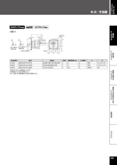 インダクションギアモータ6-2.寸法図オプション技術資料F2/F3タイプ同心中空軸・同心中実軸F/FAタイプ中空軸・中実軸H/H2タイプ直交軸G/G3タイプ平行軸G3タイプ平行軸軸径22小フランジ取付<図1>4.5Sa5b51016φ11H7深さ33(基準□面)Sφ14F7深さ36(基準□面)Sφ110G7φ130φ160A12194754035φ22h6φ60h7624.5M8×P1.25深さ2010514280894-M8×P1.25深さB4-φ8.66161140101010相当容量0.1kW0.2kW0.4kW型式G3KS-22-***-010G3KS-22-***-020G3KS-22-***-040※型式の***には減速比が入ります。※性能表はP.182をご参照ください。※モータ取り付け部詳細はP.625をご参照ください。減速比60,80,100,120,160,20030,40,50,60,80,1005,10,15,20,25図番111概略質量(kg)555.5入力軸部aabA185185189.5B11(カンツウ)11(カンツウ)20193
