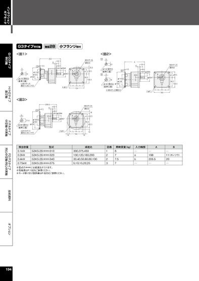 インダクションギアモータG/G3タイプ平行軸H/H2タイプ直交軸F/FAタイプ中空軸・中実軸F2/F3タイプ同心中空軸・同心中実軸技術資料オプションG3タイプ平行軸軸径28小フランジ取付<図1>5104-M8×P1.25深さ11(カンツウ)2541545254540φ28h6φ80h78S4.5φ110G7φ130φ160φ11H7深さ33(基準□面)SM8×P1.25深さ2025.547.558.594.5105.5<図2>a510φ11H7深さ33(基準□面)b5S4.5SA1523.55254540φ110G7φ130φ16016φ14F7深さ36(基準□面)S4-M8×P1.25深さBM8×P1.25深さ2047.558.594.5105.5φ28h6φ80h78314-φ117171164314-φ117171164<図3>4.5S6φ130G7φ165φ20021.5φ19F7深さ42(基準□面)S4-M10×P1.5深さ23(カンツウ)209.51523.55254540φ28h6φ80h7M8×P1.25深さ201847.558.594.5105.58314-φ117171164181818相当容量0.1kW0.2kW0.4kW0.75kW型式G3KS-28-***-010G3KS-28-***-020G3KS-28-***-040G3KS-28-***-075※型式の***には減速比が入ります。※性能表はP.182をご参照ください。※モータ取り付け部詳細はP.625をご参照ください。減速比300,375,450100,120,160,20030,40,50,60,80,1005,10,15,20,25図番1223概略質量(kg)877.57入力軸部─ab─A─198205.5─B─11(カンツウ)20─194