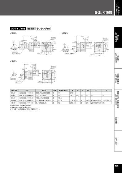 インダクションギアモータ6-2.寸法図オプション技術資料F2/F3タイプ同心中空軸・同心中実軸F/FAタイプ中空軸・中実軸H/H2タイプ直交軸G/G3タイプ平行軸G3タイプ平行軸軸径32小フランジ取付<図1><図2>S4.5φ110G7φ130φ160510φ11H7深さ33(基準□面)S4-M8×P1.25深さ11(カンツウ)A15B6355550φ32h6φ88h710354-φ138686198<図3>4.5SCA1528.56355550Dφ130G7φ165φ200E(基準□面)Sφ32h6φ88h710354.5S516φ14F7深さ36(基準□面)Sφ110G7φ130φ1604-M8×P1.25深さ20224.51528.56355550φ32h6φ88h710354-φ138686198M10×P1.5深さ2558.571.5113.5126.5M10×P1.5深さ251458.571.5113.5126.5M10×P1.5深さ2558.571.5113.5126.54-M10×P1.5深さF4-φ131868619821相当容量型式0.1kW0.2kW0.4kW0.75kW1.5kWG3KS-32-***-010G3KS-32-***-020G3KS-32-***-040G3KS-32-***-075G3KS-32-***-150減速比600,750,900,1200300,375,450100,120,160,20030,40,50,60,80,1005,10,15,20,25図番11233概略質量(kg)111110.510.512A273293─238.5256.5B-15.5───C───68D───21.527EF───φ19F7深さ42φ24F7深さ52───23(カンツウ)25※型式の***には減速比が入ります。※性能表はP.182をご参照ください。※モータ取り付け部詳細はP.625をご参照ください。195
