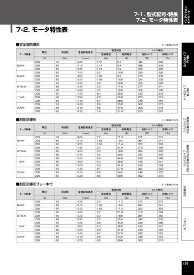 インダクションギアモータ7-1.型式記号・特長7-2.モータ特性表オプション技術資料F2/F3タイプ同心中空軸・同心中実軸F/FAタイプ中空軸・中実軸H/H2タイプ直交軸G/G3タイプ平行軸7-2.モータ特性表■安全増防爆形モータ単体の特性モータ容量電圧(V)周波数(Hz)定格回転速度(r/min)電流特性トルク特性定格電流(A)始動電流(A)始動トルク(%)停動トルク(%)0.2kW0.4kW0.75kW1.5kW2.2kW200200220200200220200200220200200220200200220■耐圧防爆形モータ容量電圧(V)0.4kW0.75kW1.5kW2.2kW200200220200200220200200220200200220■耐圧防爆形ブレーキ付モータ容量電圧(V)0.4kW0.75kW1.5kW2.2kW2002002202002002202002002202002002205060605060605060605060605060605060605060605060605060605060605060605060605060601430171017301420170017201430172017301420169017101430171017301.371.141.192.21.921.953.63.33.26.46.05.78.88.57.96.15.45.910.09.210.020.017.018.030.026.028.055.047.051.0342286350329273334325277338243203249262208255360335408300278338299271330243216264273244297周波数(Hz)定格回転速度(r/min)電流特性トルク特性定格電流(A)始動電流(A)始動トルク(%)停動トルク(%)モータ単体の特性1430171017201430172017301420170017201430171017202.21.931.933.73.33.26.96.36.09.78.98.511.310.411.421.018.620.544.038.041.857.054.259.6272264323310284347239195239282248302273247300284263320266241294252222270周波数(Hz)定格回転速度(r/min)電流特性トルク特性定格電流(A)始動電流(A)始動トルク(%)停動トルク(%)モータ単体の特性1430171017201430172017301420170017201430171017202.21.931.933.73.33.26.96.36.09.78.98.511.310.411.421.018.620.544.038.041.857.054.259.6272264323310284347239195239282248302273247300284263320266241294252222270197