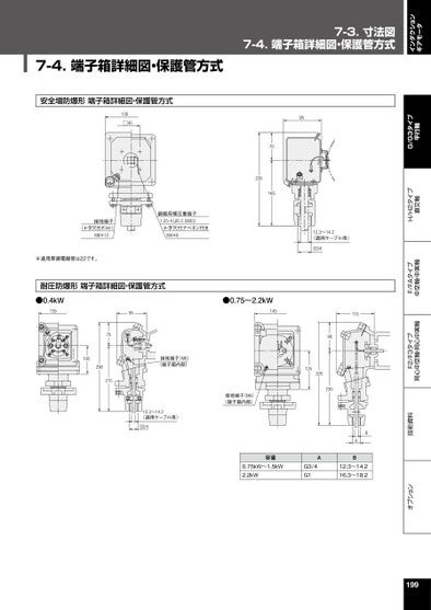 インダクションギアモータ7-3.端子箱詳細図・保護管方式7-4.結線・選定上のご注意オプション技術資料F2/F3タイプ同心中空軸・同心中実軸F/FAタイプ中空軸・中実軸H/H2タイプ直交軸G/G3タイプ平行軸-3.7-4.端子箱詳細図・保護7-4.端子箱詳細図・保護管方式安全増防爆形端子箱詳細図・保護管方式130□459570165235接地端子(十字穴付ボルト)M6×12銅線用裸圧着端子1.25-4(JISC2805)十字穴付ナベネジ付きM4×812.3~14.2(適用ケーブル径)G3/4※適用厚鋼電線管は22です。耐圧防爆形端子箱詳細図・保護管方式●0.4kW13595●0.75〜2.2kW14511575215105290接地端子(M6)(端子箱内部)12.3~14.2(適用ケーブル径)G3/4接地端子(M6)(端子箱内部)90230125320容量0.75kW~1.5kW2.2kWAG3/4G1BAB12.3~14.216.3~18.2199