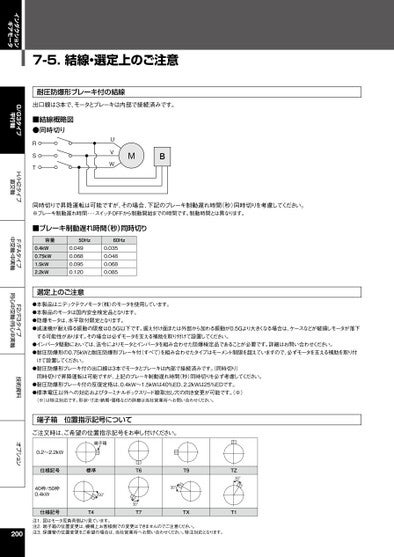 インダクションギアモータG/G3タイプ平行軸H/H2タイプ直交軸F/FAタイプ中空軸・中実軸F2/F3タイプ同心中空軸・同心中実軸技術資料オプション7-5.結線・選定上のご注意耐圧防爆形ブレーキ付の結線出口線は3本で、モータとブレーキは内部で接続済みです。■結線概略図●同時切りRSTUVWMB同時切りで昇降運転は可能ですが、その場合、下記のブレーキ制動遅れ時間(秒)同時切りを考慮してください。※ブレーキ制動遅れ時間・・・スイッチOFFから制動開始までの時間です。制動時間とは異なります。■ブレーキ制動遅れ時間(秒)同時切り容量50Hz60Hz0.4kW0.75kW1.5kW2.2kW0.0490.0680.0950.120選定上のご注意0.0350.0480.0680.085●本製品はニデックテクノモータ(株)のモータを使用しています。●本製品のモータは国内安全検定品となります。●防爆モータは、水平取付限定となります。●減速機が耐え得る振動の限度は0.5G以下です。据え付け面または外部から加わる振動が0.5Gより大きくなる場合は、ケースなどが破損しモータが落下する可能性があります。その場合は必ずモータを支える補助を取り付けて設置してください。●インバータ駆動においては、法令によりモータとインバータを組み合わせた防爆検定品であることが必要です。詳細はお問い合わせください。●耐圧防爆形の0.75kWと耐圧防爆形ブレーキ付(すべて)を組み合わせたタイプはモーメント制限を超えていますので、必ずモータを支える補助を取り付けて設置してください。●耐圧防爆形ブレーキ付の出口線は3本でモータとブレーキは内部で接続済みです。(同時切り)同時切りで昇降運転は可能ですが、上記のブレーキ制動遅れ時間(秒)同時切りを必ず考慮してください。●耐圧防爆形ブレーキ付の反復定格は、0.4kW~1.5kWは40%ED、2.2kWは25%EDです。●標準電圧以外への対応およびターミナルボックスリード線取出し穴の向き変更が可能です。(※)(※)は特注対応です。形状・寸法・納期・価格などの詳細は当社営業所へお問い合わせください。端子箱位置指示記号についてご注文時は、ご希望の位置指示記号をお申し付けください。0.2~2.2kW端子箱仕様記号標準T640枠/50枠0.4kW30°仕様記号T430°T730°T9TXTZ30°T1注1.図はモータ反負荷側より見ています。注2.端子箱の位置変更は、機構上お客様側での変更はできませんのでご注意ください。注3.保護管の位置変更をご希望の場合は、当社営業所へお問い合わせください。特注対応となります。200