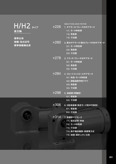 H/H2タイプ直交軸標準仕様機種・型式記号標準機種構成表P.226P.260P.278P.284P.298P.306P.314INDUCTIONGEARMOTOR1.ギアモータ/ブレーキ付ギアモータ1-1.モータ特性表1-2.性能表1-3.寸法図2.防水ギアモータ/防水ブレーキ付きギアモータ2-1.モータ特性表2-2.性能表2-3.寸法図3.クラッチ/ブレーキ付ギアモータ3-1.モータ特性表3-2.性能表3-3.寸法図4.スピードコントロールギアモータ4-1.特長・モータ特性表4-2.回転速度特性グラフ4-3.性能表4-4.寸法図5.減速機(両軸型)5-1.性能表5-2.寸法図6.S型減速機(指定モータ取付可能型)6-1.性能表6-2.寸法図7.防爆形ギアモータ7-1.型式記号・特長7-2.モータ特性表7-3.寸法図7-4.端子箱詳細図・保護管方式7-5.結線・選定上のご注意201