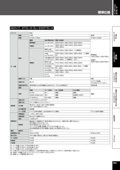 標準仕様インダクションギアモータオプション技術資料F2/F3タイプ同心中空軸・同心中実軸F/FAタイプ中空軸・中実軸H/H2タイプ直交軸G/G3タイプ平行軸H2タイプギアモータ・ブレーキ付ギアモータシリーズ相数容量MID三相0.1kW~2.2kW種類標準電圧倍電圧電源異電圧モータ部耐熱クラスF種始動方式直入れ海外規格対応UL・CE・CCCUL・CE・CCC韓国・台湾UL・CE・CCC中国UL・CE・CCC中国・韓国・台湾UL・CE・CCC欧州・北米UL・cUL・CE・CCC北米・欧州UL・cUL・CE・CCC北米・欧州UL・cUL・CE・CCCカナダUL・cUL電源/周波数200V/50Hz、200V/60Hz、220V/60Hz380V/50Hz、400V/50Hz、400V/60Hz、440V/60Hz220V/60Hz、380V/60Hz(二重電圧)220V/50Hz、230V/50Hz、380V/50Hz(二重電圧)220V/50Hz、220V/60Hz、380V/50Hz、380V/60Hz(二重電圧)(注1)415V/50Hz、440V/50Hz、480V/60Hz230V/60Hz、460V/60Hz、400V/50Hz(二重電圧)(注2)208V/60Hz、230V/60Hz、460V/60Hz、400V/50Hz(注3)575V/60Hz保護冷却方式極数定格減速方式潤滑方式減速部出力軸出力軸材質ケース材質周囲温度周囲湿度高度雰囲気周囲条件塗装色塗装保護構造(注6)取付方向モータ特性性能表寸法図モータ効率IE1IE2IE3、GB3CCC規格連続短時間(120分)連続UL・CE規格連続連続連続全閉外扇(0.1kW全機種と0.2kWのブレーキなしは全閉自冷)4容量0.1kW0.2kW、0.4kW(注4)0.75kW以上ハイポイドギアとヘリカルギアグリース潤滑(メンテナンスフリー)新JISキー(JISB1301-1996普通形)※キー材は付属されています。炭素鋼アルミ(50枠は鋳鉄、1.5kW40枠はアルミ鋳物)-10℃~40℃(注5)85%以下(結露なきこと)1,000m以下腐食性ガス・爆発性ガス・蒸気・薬品などがかからない、換気の良い場所であること。雨が直接かかることがないこと。日光が直接あたることがないこと。ブレーキに水・粉塵・油脂類・オイルミストが付着しないこと。防水保護等級がIPX0の機種は、製品に水が直接かからないこと。グレーIP44orIP40水平、垂直、傾斜など、据え付け角度の制限なしP.228P.233P.241単相0.1kW~0.4kW標準電圧100V/50Hz、100V/60Hz倍電圧200V/50Hz、200V/60HzB種コンデンサ始動(0.1kWはコンデンサラン)全閉外扇連続アルミ(50枠は鋳鉄)IP40orIP44P.229P.236P.242注1.モータ容量0.1kW~0.75kW対象となります。注2.モータ容量0.75kW~2.2kW対象となります。注3.モータ容量0.1kW~0.4kW対象となります。注4.三相0.2kW、0.4kWはCCC規格品としては短時間定格仕様として認証されていますので、ご使用の際はご注意ください。注5.単相モータ容量0.1kW(コンデンサラン)については0℃~40℃となります。注6.機種によって保護構造は異なります。203