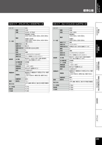 標準仕様インダクションギアモータオプション技術資料F2/F3タイプ同心中空軸・同心中実軸F/FAタイプ中空軸・中実軸H/H2タイプ直交軸G/G3タイプ平行軸H2タイプクラッチ/ブレーキ付ギアモータHタイプスピードコントロールギアモータシリーズモータ部相数容量電源耐熱クラス始動方式保護冷却方式極数定格減速方式潤滑方式減速部出力軸出力軸材質ケース材質周囲温度周囲湿度高度雰囲気設置場所塗装色周囲条件塗装取付方向モータ特性性能表寸法図MID三相0.2kW~0.75kW標準電圧(3定格)200V/50Hz、200V/60Hz、220V/60Hz倍電圧(4定格)380V/50Hz、400V/50Hz、400V/60Hz、440V/60HzF種直入れ全閉外扇(0.2kWは全閉)4連続ハイポイドギアとヘリカルギアグリース潤滑(メンテナンスフリー)新JISキー(JISB1301-1996普通形)※キー材は付属されています。炭素鋼アルミ-10℃~40℃85%以下(結露なきこと)1,000m以下腐食性ガス・爆発性ガス・蒸気などのない場所であること。じんあいを含まない換気の良い場所であること。屋内グレー水平、垂直、傾斜など、据え付け角度の制限なしP.278P.279P.280シリーズモータ部相数容量電源耐熱クラス始動方式保護冷却方式極数定格減速方式潤滑方式減速部出力軸出力軸材質ケース材質周囲温度周囲湿度高度雰囲気設置場所塗装色周囲条件塗装取付方向モータ特性性能表寸法図MINI単相15W~90W標準電圧100V/50Hz、100V/60Hz倍電圧200V/50Hz、200V/60HzB種コンデンサラン全閉自冷(60~90Wは強制ファン付)4連続ハイポイドギアとヘリカルギアグリース潤滑(メンテナンスフリー)新JISキー(JISB1301-1996普通形)※キー材は付属されています。炭素鋼アルミ-10℃~40℃85%以下(結露なきこと)1,000m以下腐食性ガス・爆発性ガス・蒸気などのない場所であること。じんあいを含まない換気の良い場所であること。屋内グレー水平、垂直、傾斜など、据え付け角度の制限なしP.284P.286P.289205