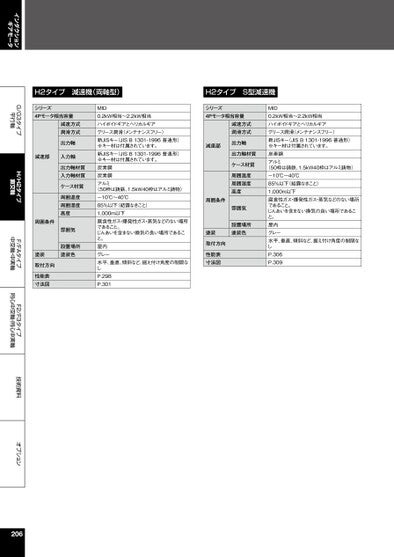 インダクションギアモータG/G3タイプ平行軸H/H2タイプ直交軸F/FAタイプ中空軸・中実軸F2/F3タイプ同心中空軸・同心中実軸技術資料オプションH2タイプ減速機(両軸型)H2タイプS型減速機シリーズ4Pモータ相当容量減速方式潤滑方式出力軸減速部入力軸出力軸材質入力軸材質ケース材質周囲温度周囲湿度高度雰囲気設置場所塗装色周囲条件塗装取付方向性能表寸法図MID0.2kW相当~2.2kW相当ハイポイドギアとヘリカルギアグリース潤滑(メンテナンスフリー)新JISキー(JISB1301-1996普通形)※キー材は付属されています。新JISキー(JISB1301-1996普通形)※キー材は付属されています。炭素鋼炭素鋼アルミ(50枠は鋳鉄、1.5kW40枠はアルミ鋳物)-10℃~40℃85%以下(結露なきこと)1,000m以下腐食性ガス・爆発性ガス・蒸気などのない場所であること。じんあいを含まない換気の良い場所であること。屋内グレー水平、垂直、傾斜など、据え付け角度の制限なしP.298P.301シリーズ4Pモータ相当容量減速方式潤滑方式出力軸出力軸材質ケース材質周囲温度周囲湿度高度雰囲気設置場所塗装色減速部周囲条件塗装取付方向性能表寸法図MID0.2kW相当~2.2kW相当ハイポイドギアとヘリカルギアグリース潤滑(メンテナンスフリー)新JISキー(JISB1301-1996普通形)※キー材は付属されています。炭素鋼アルミ(50枠は鋳鉄、1.5kW40枠はアルミ鋳物)-10℃~40℃85%以下(結露なきこと)1,000m以下腐食性ガス・爆発性ガス・蒸気などのない場所であること。じんあいを含まない換気の良い場所であること。屋内グレー水平、垂直、傾斜など、据え付け角度の制限なしP.306P.309206