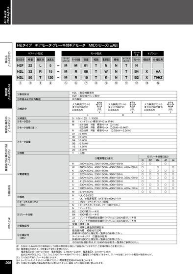 インダクションギアモータG/G3タイプ平行軸H/H2タイプ直交軸F/FAタイプ中空軸・中実軸F2/F3タイプ同心中空軸・同心中実軸技術資料オプションオプション補助記号仕様記号AAT9HZ⑭XX⑬ブレーキ仕様ブレーキ4NBB2⑫取付区分枠番軸区分減速比モータシリーズモータ仕様容量相数電源電圧規格ターミナルボックスTTT⑪NNN⑩NWK⑨TTT⑧010815⑦MRR⑥MMM⑤515120④LRT③H2FH2LH2L①223250②ギアヘッド型式モータ型式H2タイプギアモータ・ブレーキ付ギアモータMIDシリーズ[三相]①取付区分②枠番および出力軸径③軸区分④減速比⑤モータ区分⑥モータ仕様(注1)⑦モータ容量⑧相数⑨電源電圧⑩規格⑪ターミナルボックス(注4)⑫ブレーキ仕様⑬補助記号⑭仕様記号(注5)入力軸側()から見て出力軸が両方に出るものT⑫ブレーキ仕様(注3)N〇〇〇〇〇〇〇〇〇B2〇〇〇〇〇〇〇B4〇〇〇〇〇〇〇J2〇〇〇〇〇〇〇J4〇〇〇〇〇〇〇H2L:直交軸脚取付H2F:直交軸フランジ取付出力軸径)から入力軸側(見て出力軸が左に出るものギアヘッドモータ入力軸側()から見て出力軸が右に出るものLR5:1/5~15X:1/1500MM:インダクション標準(IP40orIP44):IE1効率F種標準モータ(0.1kW)IE2効率F種標準モータ(0.2kW~0.4kW):IE3効率F種標準モータ(0.75kW~2.2kW):0.1kW:0.2kW:0.4kW:0.75kW:1.5kW:2.2kW:三相R010204081522T⑨電源電圧(注2):200V/50Hz、200V/60Hz、220V/60Hz:380V/50Hz、400V/50Hz、400V/60Hz、440V/60Hz:220V/60Hz、380V/60Hz:220V/50Hz、230V/50Hz、380V/50Hz:220V/50Hz、220V/60Hz、380V/50Hz、380V/60Hz:415V/50Hz、440V/50Hz、480V/60Hz:230V/60Hz、460V/60Hz、400V/50Hz:208V/60Hz、230V/60Hz、460V/60Hz、400V/50Hz:575V/60Hz:UL・CE・CCC:UL※電源電圧:M(575V/60Hz)のみ:T型ターミナルボックス(鋼板):ターミナルボックスなし(リード線バラ出し):ブレーキなし:200V級ブレーキ付:400V級ブレーキ付:ブレーキ手動解放装置付(オプション)200V級ブレーキ付:ブレーキ手動解放装置付(オプション)400V級ブレーキ付NWKCDEUAMNATNNB2B4J2J4空欄:標準仕様X整流器内蔵結線指示記号詳細はP.559の仕様記号一覧表をご参照ください。ターミナルボックス位置指示記号詳細はP.580の仕様記号一覧表をご参照ください。その他の仕様記号は、P.1249の仕様記号一覧表をご参照ください。:特殊仕様追加認識記号注1.0.2kW、0.4kWはCCC規格品としては短時間定格仕様として認証されていますので、ご使用の際はご注意ください。注2.電源電圧の対応モータ容量は下記をご参照ください。電源電圧D:0.1kW~0.75kW電源電圧U:0.75kW~2.2kW電源電圧A:0.1kW~0.4kW型式記号が「K」、C」、D」、「U」、A」のブレーキ付ギアモータは二重電圧での使用はできません。ブレーキ仕様によりモータ電圧が制限されます。注3.〇は対応可能なブレーキ仕様となります。注4.ターミナルボックスなし(リード線バラ出し)は電源電圧記号Nのみ対象となります。注5.仕様記号は銘板の製品型式名には表示されません。銘板上の仕様記号欄に表示されます。208