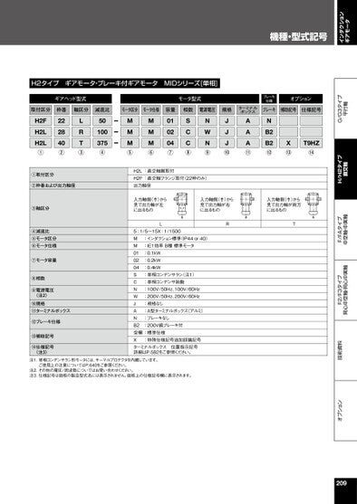 機種・型式記号インダクションギアモータオプション技術資料F2/F3タイプ同心中空軸・同心中実軸F/FAタイプ中空軸・中実軸H/H2タイプ直交軸G/G3タイプ平行軸209ギアヘッド型式モータ型式ブレーキ仕様オプション取付区分枠番軸区分減速比モータ区分モータ仕様容量相数電源電圧規格ターミナルボックスブレーキ補助記号仕様記号T9HZ⑭⑬XNB22⑫BAA⑪AJJ⑩JNW⑨NSC⑧C01024⑦0MM⑥MMM⑤MH2FH2LH2L①222840②LRT③50100375④H2タイプギアモータ・ブレーキ付ギアモータMIDシリーズ[単相]①取付区分②枠番および出力軸径H2L:直交軸脚取付H2F:直交軸フランジ取付(22枠のみ)出力軸径③軸区分④減速比⑤モータ区分⑥モータ仕様⑦モータ容量⑧相数⑨電源電圧(注2)⑩規格⑪ターミナルボックス⑫ブレーキ仕様⑬補助記号⑭仕様記号(注3)入力軸側()から見て出力軸が左に出るものギアヘッドモータ入力軸側()から見て出力軸が右に出るもの入力軸側()から見て出力軸が両方に出るものLRT:インダクション標準(IP44or40):IE1効率B種標準モータ:0.1kW:0.2kW:0.4kW:単相コンデンサラン(注1):単相コンデンサ始動:100V/50Hz、100V/60Hz:200V/50Hz、200V/60Hz:規格なし:A型ターミナルボックス(アルミ):ブレーキなし:200V級ブレーキ付5:1/5~15X:1/1500MM010204SCNWJANB2空欄:標準仕様Xターミナルボックス位置指示記号詳細はP.582をご参照ください。:特殊仕様記号追加認識記号注1.単相コンデンサラン形モータには、サーマルプロテクタを内蔵しています。ご使用上の注意についてはP.640をご参照ください。注2.その他の電圧/周波数についてはお問い合わせください。注3.仕様記号は銘板の製品型式名には表示されません。銘板上の仕様記号欄に表示されます。