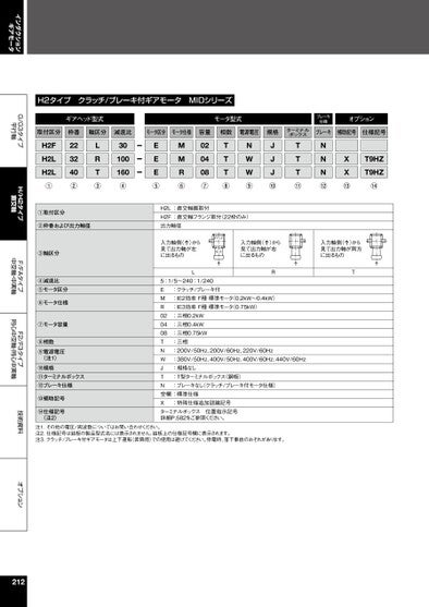 インダクションギアモータG/G3タイプ平行軸H/H2タイプ直交軸F/FAタイプ中空軸・中実軸F2/F3タイプ同心中空軸・同心中実軸技術資料オプションギアヘッド型式モータ型式ブレーキ仕様オプション取付区分枠番軸区分減速比モータ区分モータ仕様容量相数電源電圧規格ターミナルボックスブレーキ補助記号仕様記号T9HZT9HZ⑭X⑬XNN⑫NTT⑪TJJ⑩JNW⑨WTT⑧T02048⑦0MM⑥REE⑤EH2FH2LH2L①223240②LRT③30100160④H2タイプクラッチ/ブレーキ付ギアモータMIDシリーズ①取付区分②枠番および出力軸径H2L:直交軸脚取付H2F:直交軸フランジ取付(22枠のみ)出力軸径③軸区分④減速比⑤モータ区分⑥モータ仕様⑦モータ容量⑧相数⑨電源電圧(注1)⑩規格⑪ターミナルボックス⑫ブレーキ仕様⑬補助記号⑭仕様記号(注2)入力軸側()から見て出力軸が左に出るものギアヘッドモータ入力軸側()から見て出力軸が右に出るもの入力軸側()から見て出力軸が両方に出るものLRT:クラッチ/ブレーキ付:IE2効率F種標準モータ(0.2kW~0.4kW):IE3効率F種標準モータ(0.75kW):三相0.2kW:三相0.4kW:三相0.75kW:三相:200V/50Hz、200V/60Hz、220V/60Hz:380V/50Hz、400V/50Hz、400V/60Hz、440V/60Hz:規格なし:T型ターミナルボックス(鋼板):ブレーキなし(クラッチ/ブレーキ付モータ仕様)5:1/5~240:1/240EMR020408TNWJTN空欄:標準仕様Xターミナルボックス位置指示記号詳細P.582をご参照ください。:特殊仕様追加認識記号注1.その他の電圧/周波数についてはお問い合わせください。注2.仕様記号は銘板の製品型式名には表示されません。銘板上の仕様記号欄に表示されます。注3.クラッチ/ブレーキ付ギアモータは上下運転(昇降用)での使用は避けてください。停電時、落下事故のおそれがあります。212