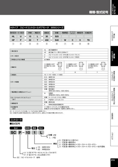 機種・型式記号インダクションギアモータオプション技術資料F2/F3タイプ同心中空軸・同心中実軸F/FAタイプ中空軸・中実軸H/H2タイプ直交軸G/G3タイプ平行軸①取付区分②モータ区分③枠番および出力軸径④軸区分⑤減速比⑥モータ容量⑦電源電圧(倍電圧はオプション)⑧ターミナルボックス(オプション)(注1)⑨補助記号⑩仕様記号(注2):直交軸脚取付HLHF:直交軸フランジ取付(22枠まで)UP出力軸径:スピードコントロールモータ付U型(コントローラセット):スピードコントロールモータ付P型(コントローラ別売)入力軸側から見て出力軸が左に出るものギアヘッドモータ入力軸側から見て出力軸が右に出るもの入力軸側から見て出力軸が両方に出るものLRT10:1/10~1800:1/1800S15:単相15WS25:単相25WS40:単相40WS60:単相60WS90:単相90W空欄:標準電圧単相100V/50Hz、100V/60HzW:倍電圧単相200V/50Hz、200V/60Hz:P型用ターミナルボックス空欄:ターミナルボックスなし(標準)C空欄:標準仕様Xリード線・ターミナルボックス位置指示記号詳細はP.579の仕様記号一覧表をご参照ください。:特殊仕様追加認識記号電源電圧ターミナルボックス補助記号仕様記号W⑦C⑧X⑨T6⑩容量S25S40⑥取付区分モータ区分枠番軸区分減速比30450⑤LT④1522③UP②HLHF①HタイプスピードコントロールギアモータMINIシリーズ注1.ターミナルボックスの仕様についてはP.636をご参照ください。注2.仕様記号は銘板の製品型式名には表示されません。銘板上の仕様記号欄に表示されます。コントローラ■型式記号型式電源電圧機能型式SCP101L空欄:U型:P型L機能0:可変速のみ(U型のみ)1:可変速+瞬時停止2:可変速+瞬時停止+スロースタート・スローダウン3:可変速+瞬時停止+スロースタート・スローダウン+並列運転電圧10:単相100V20:単相200VU:U型(ギアモータとセットになっております)P:P型(ギアモータとは別売りです)SC:スピードコントローラ総称213