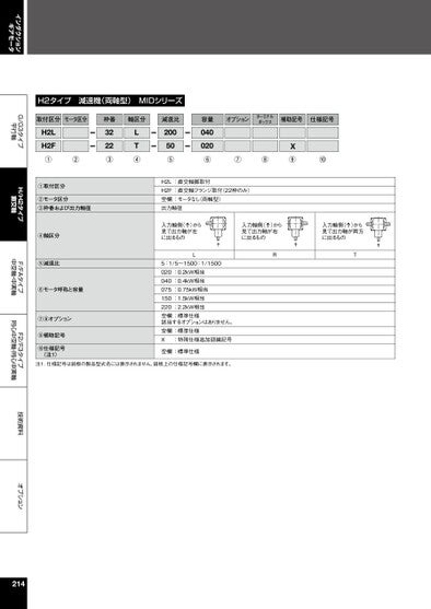 インダクションギアモータG/G3タイプ平行軸H/H2タイプ直交軸F/FAタイプ中空軸・中実軸F2/F3タイプ同心中空軸・同心中実軸技術資料オプション①取付区分②モータ区分③枠番および出力軸径④軸区分⑤減速比⑥モータ呼称と容量⑦⑧オプション⑨補助記号⑩仕様記号(注1)H2L:直交軸脚取付H2F:直交軸フランジ取付(22枠のみ)空欄:モータなし(両軸型)出力軸径入力軸側()から見て出力軸が左に出るもの入力軸側()から見て出力軸が右に出るもの入力軸側()から見て出力軸が両方に出るものLRT5:1/5~1500:1/1500020:0.2kW相当040:0.4kW相当075:0.75kW相当150:1.5kW相当220:2.2kW相当空欄:標準仕様該当するオプションはありません。空欄:標準仕様X:特殊仕様追加認識記号空欄:標準仕様注1.仕様記号は銘板の製品型式名には表示されません。銘板上の仕様記号欄に表示されます。オプションターミナルボックス補助記号仕様記号⑦⑧X⑨⑩容量040020⑥取付区分モータ区分枠番軸区分減速比20050⑤LT④3222③H2LH2F①②H2タイプ減速機(両軸型)MIDシリーズ214