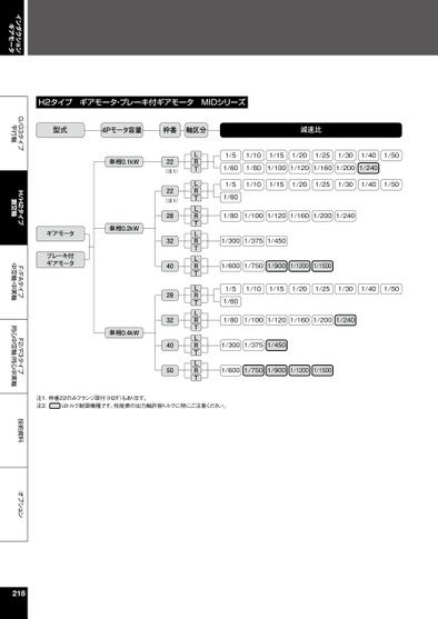 インダクションギアモータG/G3タイプ平行軸H/H2タイプ直交軸F/FAタイプ中空軸・中実軸F2/F3タイプ同心中空軸・同心中実軸技術資料オプション1/51/101/151/201/251/301/401/501/601/801/1001/1201/1601/2001/2401/51/101/151/201/251/301/401/501/601/801/1001/1201/1601/2001/2401/3001/3751/4501/6001/7501/9001/12001/15001/51/101/151/201/251/301/401/501/601/801/1001/1201/1601/2001/2401/3001/3751/4501/6001/7501/9001/12001/1500LRTLRTLRTLRTLRTLRTLRTLRTRLT22(注1)22(注1)28324028324050単相0.1kW単相0.2kW単相0.4kWギアモータブレーキ付ギアモータ注1.枠番22のみフランジ取付(H2F)もあります。注2.はトルク制限機種です。性能表の出力軸許容トルクに特にご注意ください。H2タイプギアモータ・ブレーキ付ギアモータMIDシリーズ型式4Pモータ容量枠番軸区分減速比218