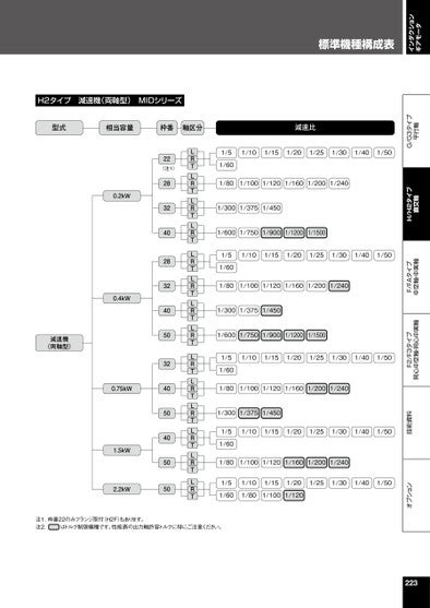 標準機種構成表インダクションギアモータオプション技術資料F2/F3タイプ同心中空軸・同心中実軸F/FAタイプ中空軸・中実軸H/H2タイプ直交軸G/G3タイプ平行軸2231/51/101/151/201/251/301/401/501/601/801/1001/1201/1601/2001/2401/3001/3751/4501/6001/7501/9001/12001/15001/51/101/151/201/251/301/401/501/601/801/1001/1201/1601/2001/2401/3001/3751/4501/6001/7501/9001/12001/15001/51/101/151/201/251/301/401/501/601/801/1001/1201/1601/2001/2401/3001/3751/4501/51/101/151/201/251/301/401/501/601/801/1001/1201/1601/2001/2401/51/101/151/201/251/301/401/501/601/801/1001/120LRTLRTLRTLRTLRTLRTLRTRLTLRTLRTLRTLRTLRTLRT22(注1)283240283240503240504050500.2kW0.4kW0.75kW1.5kW2.2kW減速機(両軸型)H2タイプ減速機(両軸型)MIDシリーズ型式相当容量枠番軸区分減速比注1.枠番22のみフランジ取付(H2F)もあります。注2.はトルク制限機種です。性能表の出力軸許容トルクに特にご注意ください。