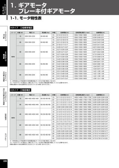 インダクションギアモータG/G3タイプ平行軸H/H2タイプ直交軸F/FAタイプ中空軸・中実軸F2/F3タイプ同心中空軸・同心中実軸技術資料オプション1.ギアモータブレーキ付ギアモータ1-1.モータ特性表Hタイプ三相標準電圧シリーズ容量(W)電圧(V)周波数(Hz)1525200/200/22050/60/60200/200/22050/60/6040200/200/22050/60/60MINI60200/200/22050/60/6090200/200/22050/60/60枠番15221522281518222832151822283218283240定格電流(A)定格回転速度(r/min)始動電流(A)0.14/0.13/0.130.14/0.13/0.130.21/0.19/0.190.21/0.19/0.190.18/0.17/0.170.29/0.27/0.270.27/0.26/0.260.29/0.27/0.270.27/0.26/0.260.27/0.26/0.260.42/0.39/0.390.40/0.36/0.360.42/0.39/0.390.40/0.36/0.360.40/0.36/0.360.51/0.48/0.480.51/0.48/0.480.51/0.48/0.480.47/0.47/0.471350/1550/16001350/1550/16001350/1550/16001350/1550/16001350/1550/16001350/1550/16001350/1550/15501350/1550/16001350/1550/15501350/1550/15501350/1550/15501350/1550/16001350/1550/15501350/1550/16001350/1550/16001350/1550/15501350/1550/15501350/1550/15501350/1550/16000.30/0.28/0.310.30/0.28/0.310.44/0.42/0.460.44/0.42/0.460.43/0.41/0.460.67/0.62/0.680.73/0.69/0.760.67/0.62/0.680.73/0.69/0.760.73/0.69/0.760.94/0.86/1.001.04/0.97/1.070.94/0.86/1.001.04/0.97/1.071.04/0.97/1.071.42/1.36/1.491.42/1.36/1.491.42/1.36/1.491.59/1.51/1.66モータ特性表および性能表中の定格電流値はモータのみの値が表記してあります。ブレーキ付ギアモータの場合は、必要に応じてブレーキを流れる電流値を考慮していただく必要があります。詳細は最寄りの当社営業所またはCSセンターまでお問い合わせください。Hタイプ三相倍電圧シリーズ容量(W)電圧(V)周波数(Hz)1525380/400/400/44050/50/60/60380/400/400/44050/50/60/6040380/400/400/44050/50/60/60MINI60380/400/400/44050/50/60/6090380/400/400/44050/50/60/60枠番152215222815182228321822283218283240定格電流(A)定格回転速度(r/min)始動電流(A)0.11/0.12/0.10/0.110.11/0.12/0.10/0.110.11/0.12/0.11/0.120.11/0.12/0.11/0.120.09/0.09/0.09/0.090.14/0.14/0.14/0.140.13/0.14/0.13/0.140.14/0.14/0.14/0.140.13/0.14/0.13/0.140.13/0.14/0.13/0.140.17/0.17/0.17/0.170.20/0.20/0.20/0.200.17/0.17/0.17/0.170.17/0.17/0.17/0.170.26/0.26/0.26/0.260.26/0.26/0.26/0.260.26/0.26/0.26/0.260.23/0.23/0.24/0.241400/1400/1700/17001400/1400/1700/17001350/1400/1600/16501350/1400/1600/16501300/1350/1550/16001300/1350/1550/16001300/1350/1550/16001300/1350/1550/16001300/1350/1550/16001300/1350/1550/16001300/1350/1550/16001250/1300/1500/15501300/1350/1550/16001300/1350/1550/16001300/1350/1550/16001300/1350/1550/16001300/1350/1550/16001350/1350/1600/16500.26/0.28/0.26/0.290.26/0.28/0.26/0.290.26/0.28/0.26/0.290.26/0.28/0.26/0.290.20/0.21/0.20/0.220.30/0.32/0.30/0.330.33/0.35/0.33/0.370.30/0.32/0.30/0.330.33/0.35/0.33/0.370.33/0.35/0.33/0.370.43/0.45/0.43/0.470.38/0.40/0.38/0.410.43/0.45/0.43/0.470.43/0.45/0.43/0.470.70/0.74/0.69/0.770.70/0.74/0.69/0.770.70/0.74/0.69/0.770.73/0.78/0.74/0.81モータ特性表および性能表中の定格電流値はモータのみの値が表記してあります。ブレーキ付ギアモータの場合は、必要に応じてブレーキを流れる電流値を考慮していただく必要があります。詳細は最寄りの当社営業所またはCSセンターまでお問い合わせください。226
