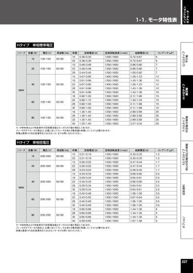 1-1.モータ特性表インダクションギアモータオプション技術資料F2/F3タイプ同心中空軸・同心中実軸F/FAタイプ中空軸・中実軸H/H2タイプ直交軸G/G3タイプ平行軸Hタイプ単相標準電圧シリーズ容量(W)電圧(V)周波数(Hz)1525100/10050/60100/10050/6040100/10050/60MINI60100/10050/6090100/10050/60枠番152215222815182228321822283218283240定格電流(A)0.39/0.350.39/0.350.48/0.480.48/0.480.44/0.450.67/0.800.61/0.660.67/0.800.61/0.660.61/0.660.90/1.000.90/1.100.90/1.000.90/1.001.30/1.401.30/1.401.30/1.401.20/1.40定格回転速度(r/min)1350/16501350/16501350/16001350/16001350/16501400/16501350/16501400/16501350/16501350/16501350/16001300/15001350/16001350/16001350/16001350/16001350/16001350/1600モータ特性表および性能表中の定格電流値はモータのみの値が表記してあります。ブレーキ付ギアモータの場合は、必要に応じてブレーキを流れる電流値を考慮していただく必要があります。詳細は最寄りの当社営業所またはCSセンターまでお問い合わせください。Hタイプ単相倍電圧シリーズ容量(W)電圧(V)周波数(Hz)1525200/20050/60200/20050/6040200/20050/60MINI60200/20050/6090200/20050/60枠番152215222815182228321822283218283240定格電流(A)0.21/0.190.21/0.190.26/0.250.26/0.250.23/0.240.34/0.330.29/0.340.34/0.330.29/0.340.29/0.340.45/0.480.43/0.500.45/0.480.45/0.480.65/0.660.65/0.660.65/0.660.59/0.65定格回転速度(r/min)1350/16501350/16501350/16001350/16001350/16501350/16001350/16001350/16001350/16001350/16001350/16001300/15001350/16001350/16001350/16001350/16001350/16001400/1650モータ特性表および性能表中の定格電流値はモータのみの値が表記してあります。ブレーキ付ギアモータの場合は、必要に応じてブレーキを流れる電流値を考慮していただく必要があります。詳細は最寄りの当社営業所またはCSセンターまでお問い合わせください。始動電流(A)コンデンサ(μF)0.72/0.670.72/0.670.86/0.800.86/0.801.00/0.921.26/1.231.43/1.361.26/1.231.43/1.361.43/1.362.11/1.981.33/1.342.11/1.982.11/1.982.89/2.682.89/2.682.89/2.683.27/3.045577712101210101515151520202020始動電流(A)コンデンサ(μF)0.35/0.330.35/0.330.47/0.440.47/0.440.46/0.450.66/0.600.64/0.610.66/0.600.64/0.610.64/0.611.06/1.000.67/0.641.06/1.001.06/1.001.44/1.351.44/1.351.44/1.351.67/1.581.21.21.71.71.72.52.52.52.52.53.53.53.53.55555227