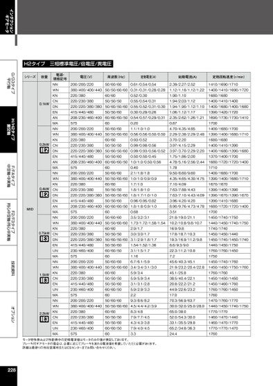 インダクションギアモータG/G3タイプ平行軸H/H2タイプ直交軸F/FAタイプ中空軸・中実軸F2/F3タイプ同心中空軸・同心中実軸技術資料オプションH2タイプ三相標準電圧/倍電圧/異電圧シリーズ容量MID0.1kW0.2kW0.4kW0.75kW1.5kW2.2kW電源・規格記号NNWNKNCNDNENANMANNWNKNCNDNENANMANNWNKNCNDNENANMANNWNKNCNDNENUNMANNWNKNCNENUNMANNWNKNCNENUNMA電圧(V)周波数(Hz)定格電流(A)始動電流(A)定格回転速度(r/min)200/200/220380/400/400/440220/380220/230/380220/220/380/380415/440/480208/230/460/400575200/200/220380/400/400/440220/380220/230/380220/220/380/380415/440/480208/230/460/400575200/200/220380/400/400/440220/380220/230/380220/220/380/380415/440/480208/230/460/400575200/200/220380/400/400/440220/380220/230/380220/220/380/380415/440/480230/460/400575200/200/220380/400/400/440220/380220/230/380415/440/480230/460/400575200/200/220380/400/400/440220/380220/230/380415/440/480230/460/40057550/60/6050/50/60/6060/6050/50/5050/60/50/6050/50/6060/60/60/506050/60/6050/50/60/6060/6050/50/5050/60/50/6050/50/6060/60/60/506050/60/6050/50/60/6060/6050/50/5050/60/50/6050/50/6060/60/60/506050/60/6050/50/60/6060/6050/50/5050/60/50/6050/50/6060/60/506050/60/6050/50/60/6060/6050/50/5050/50/6060/60/506050/60/6050/50/60/6060/6050/50/5050/50/6060/60/50600.61/0.54/0.540.31/0.31/0.28/0.280.52/0.300.55/0.54/0.310.55/0.52/0.31/0.300.30/0.29/0.260.54/0.57/0.29/0.310.201.1/1.0/1.00.56/0.56/0.50/0.500.93/0.520.99/0.98/0.560.99/0.93/0.56/0.520.50/0.50/0.451.0/1.0/0.50/0.560.402.1/1.8/1.81.0/1.0/0.9/0.91.7/1.01.8/1.8/1.01.8/1.7/1.0/1.00.96/0.95/0.821.8/1.8/0.9/1.00.683.5/3.2/3.11.73/1.72/1.58/1.542.9/1.73.0/3.0/1.73.1/2.9/1.8/1.71.54/1.52/1.363.1/1.5/1.71.166.7/6.1/5.93.4/3.4/3.1/3.05.9/3.45.9/5.9/3.43.1/3.1/2.85.9/2.9/3.32.29.3/8.6/8.24.5/4.4/4.2/3.98.3/4.87.9/7.7/4.54.3/4.3/3.87.9/4.0/4.53.32.39/2.27/2.521.12/1.18/1.12/1.221.90/1.101.94/2.03/1.121.94/1.90/1.12/1.101.06/1.12/1.172.35/2.62/1.26/1.210.874.70/4.35/4.852.29/2.38/2.29/2.483.70/2.203.97/4.15/2.293.97/3.70/2.29/2.201.75/1.86/2.004.78/5.16/2.56/2.441.789.50/8.60/9.604.35/4.65/4.30/4.757.10/4.097.63/7.88/4.437.63/7.10/4.43/4.093.96/4.20/4.208.90/9.76/4.73/4.783.5121.8/19.0/21.110.2/10.8/9.8/10.716.9/9.817.8/18.7/10.319.3/16.9/11.2/9.88.6/9.3/9.022.3/11.2/10.87.245.6/40.3/45.121.9/23.2/20.4/22.845.1/25.838.5/40.4/22.120.8/22.2/21.244.9/22.6/23.217.070.3/56.9/63.730.0/32.0/25.0/28.065.0/38.052.0/54.3/30.033.1/35.5/29.865.2/34.8/36.324.41410/1690/17101400/1410/1690/17201680/16801400/1410/14001400/1680/1400/16801390/1420/17201690/1730/1730/141017001400/1680/17001390/1400/1680/17101680/16801400/1410/13901400/1680/1390/16801370/1400/17001680/1720/1720/140017101400/1680/17001390/1400/1680/17101670/16701390/1400/13901390/1670/1390/16701390/1410/16801680/1720/1720/140017001450/1740/17501440/1450/1740/17501740/17401450/1450/14401450/1740/1450/17401440/1450/17501760/1760/145017501450/1740/17601450/1450/1750/17601760/17601450/1450/14501450/1460/17601760/1760/145017601470/1760/17701440/1450/1740/17501770/17701460/1470/14401460/1470/17701770/1770/14701760モータ特性表および性能表中の定格電流値はモータのみの値が表記してあります。ブレーキ付ギアモータの場合は、必要に応じてブレーキを流れる電流値を考慮していただく必要があります。詳細は最寄りの当社営業所またはCSセンターまでお問い合わせください。228