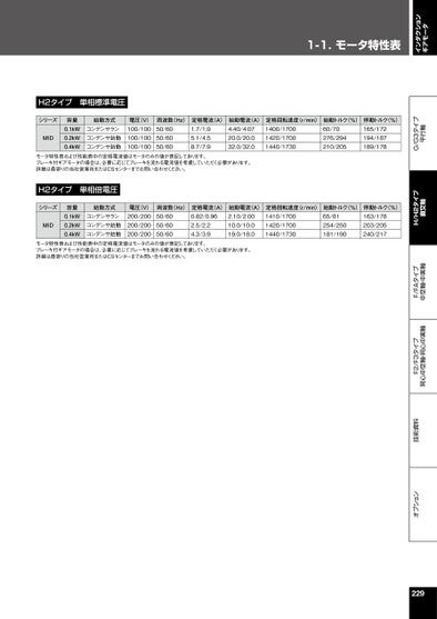 1-1.モータ特性表インダクションギアモータオプション技術資料F2/F3タイプ同心中空軸・同心中実軸F/FAタイプ中空軸・中実軸H/H2タイプ直交軸G/G3タイプ平行軸H2タイプ単相標準電圧シリーズMID容量0.1kW0.2kW0.4kW始動方式コンデンサランコンデンサ始動コンデンサ始動電圧(V)100/100100/100100/100周波数(Hz)50/6050/6050/60定格電流(A)1.7/1.95.1/4.58.7/7.9始動電流(A)4.40/4.0720.0/20.032.0/32.0モータ特性表および性能表中の定格電流値はモータのみの値が表記してあります。ブレーキ付ギアモータの場合は、必要に応じてブレーキを流れる電流値を考慮していただく必要があります。詳細は最寄りの当社営業所またはCSセンターまでお問い合わせください。H2タイプ単相倍電圧シリーズMID容量0.1kW0.2kW0.4kW始動方式コンデンサランコンデンサ始動コンデンサ始動電圧(V)200/200200/200200/200周波数(Hz)50/6050/6050/60定格電流(A)0.82/0.962.5/2.24.3/3.9始動電流(A)2.10/2.0010.0/10.019.0/18.0モータ特性表および性能表中の定格電流値はモータのみの値が表記してあります。ブレーキ付ギアモータの場合は、必要に応じてブレーキを流れる電流値を考慮していただく必要があります。詳細は最寄りの当社営業所またはCSセンターまでお問い合わせください。定格回転速度(r/min)始動トルク(%)停動トルク(%)1400/17001420/17001440/173060/70276/294210/205165/172194/187189/178定格回転速度(r/min)始動トルク(%)停動トルク(%)1410/17001420/17001440/173065/81254/250181/190163/178203/205240/217229