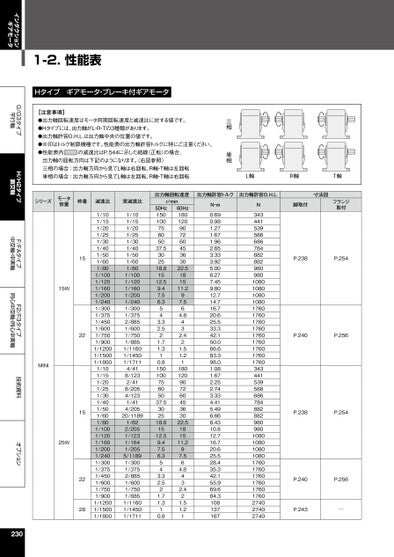 インダクションギアモータG/G3タイプ平行軸H/H2タイプ直交軸F/FAタイプ中空軸・中実軸F2/F3タイプ同心中空軸・同心中実軸技術資料オプションL軸R軸T軸三相単相●出力軸回転速度はモータ同期回転速度と減速比に対する値です。●Hタイプには、出力軸がL・R・Tの3種類があります。●出力軸許容O.H.L.は出力軸中央の位置の値です。●※印はトルク制限機種です。性能表の出力軸許容トルクに特にご注意ください。●性能表内の減速比はP.544に示した結線(正転)の場合、出力軸の回転方向は下記のようになります。右図参照)三相の場合:出力軸方向から見てL軸は右回転、R軸・T軸は左回転単相の場合:出力軸方向から見てL軸は左回転、R軸・T軸は右回転【注意事項】Hタイプギアモータ・ブレーキ付ギアモータ1-2.性能表出力軸回転速度出力軸許容トルク出力軸許容O.H.L.寸法図枠番減速比実減速比r/min1/101/151/201/251/301/401/501/601/801/1001/1201/1601/2001/2401/3001/3751/4501/6001/7501/9001/12001/15001/18001/101/151/201/251/301/401/501/601/801/1001/1201/1601/2001/2401/3001/3751/4501/6001/7501/9001/12001/15001/180015221522281/101/151/201/251/301/401/501/601/801/1001/1201/1601/2001/2401/3001/3752/8851/6001/7501/8851/11601/14501/17114/418/1232/418/2054/1231/414/2051/822/2051/1231/1641/2055/11891/3001/3752/8851/6001/7501/8851/11601/14501/171120/118950Hz15010075605037.5302518.81512.59.47.56.3543.32.521.71.310.815010075605037.5302518.81512.59.47.56.3543.32.521.71.310.860Hz18012090726045363022.5181511.27.54.8964322.41.51.2118012090726045363022.5181511.27.54.8964322.41.51.21N・m0.690.981.271.671.962.653.333.925.006.277.459.8012.714.716.720.625.533.342.150.066.683.398.01.081.672.252.743.334.415.496.668.4310.812.716.720.625.528.435.342.155.969.684.3108137167N34344153958868678488288298098010801080108010801760176017601760176017601760176017603434415395886867848828829809801080108010801080176017601760176017601760274027402740脚取付フランジ取付P.238P.254P.240P.256P.238P.254P.240P.256P.243─シリーズモータ容量MINI15W25W230