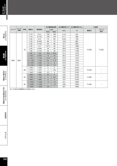 インダクションギアモータG/G3タイプ平行軸H/H2タイプ直交軸F/FAタイプ中空軸・中実軸F2/F3タイプ同心中空軸・同心中実軸技術資料オプションシリーズモータ容量MINI90W出力軸回転速度出力軸許容トルク出力軸許容O.H.L.寸法図枠番減速比実減速比r/min1/101/151/201/251/301/401/501/601/801/1001/120※1/160※1/200※1/2401/3001/3751/4501/6001/7501/9001/12001/15001/1800182832404/418/1232/418/2054/1231/414/2052/1231/822/2051/1231/1641/2051/2461/3001/3752/8851/6001/7501/9001/12001/15001/180050Hz15010075605037.5302518.81512.59.47.56.3543.32.521.71.310.860Hz18012090726045363022.5181511.297.564.8432.421.51.21N・m4.126.178.3310.812.716.720.624.531.439.247.053.953.953.9108137157216265314421529637N441588735882980108011801180127012701370137013701370274027402740510051005100706070607060脚取付フランジ取付P.239P.255P.243P.246P.249───注1.P.230の注意事項を必ずお読みください。232
