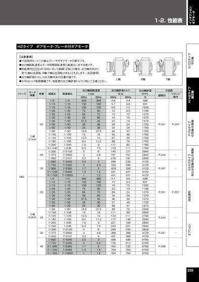 1-2.性能表インダクションギアモータオプション技術資料F2/F3タイプ同心中空軸・同心中実軸F/FAタイプ中空軸・中実軸H/H2タイプ直交軸G/G3タイプ平行軸H2タイプギアモータ・ブレーキ付ギアモータ【注意事項】●寸法図内カッコ()の値はブレーキ付ギアモータの表示です。●出力軸回転速度はモータ同期回転速度と減速比に対する値です。●性能表内はP.545に示した結線(正転)の場合、出力軸方向より見てL軸は右回転、R軸・T軸は左回転であることを示します。右図参照)●出力軸許容O.H.L.は出力軸中央の位置の値です。●※印はトルク制限機種です。性能表の出力軸許容トルクに特にご注意ください。L軸R軸T軸シリーズモータ容量枠番減速比実減速比r/min出力軸回転速度出力軸許容トルク※1/240※1/1200※1/15001/51/101/151/201/251/301/401/501/601/801/1001/1201/1601/2001/3001/3751/4501/6001/7501/9001/51/101/151/201/251/301/401/501/601/801/1001/1201/1601/2001/2401/3001/3751/4501/6001/750※1/900※1/1200※1/1500三相0.1kWMID22283222三相0.2kW2832401/51/101/151/201/251/301/401/501/591/801/1001/1201/1601/2001/2367/21207/26507/31277/42407/53007/63607/84807/106001/51/101/151/201/251/301/401/501/591/801/1001/1201/1601/2001/2367/21207/26507/31277/42407/53007/63607/84807/1060050Hz30015010075605037.5302518.81512.59.47.56.3543.32.521.71.3130015010075605037.5302518.81512.59.47.56.3543.32.521.71.3160Hz36018012090726045363022.5181511.27.54.8964322.41.51.236018012090726045363022.5181511.27.54.8964322.41.51.2N・m50Hz60Hz2.85.78.6121518232834445567881111181451812182863584294314315.71218232834465769881111331772212452943684315887357647647642.44.87.29.5121519242837465574921111211511812382983584314314.89.5151924283848577492111148184221245306368490613735764764寸法図脚取付フランジ取付P.241P.257P.244P.247──P.241P.257P.244P.247P.250───出力軸許容O.H.L.N588931103011801270137015701720176017601760176017601760176028402840284041204120412041204120588931103011801270137015701720181024502650274028402840284038204120412067606760676067606760233