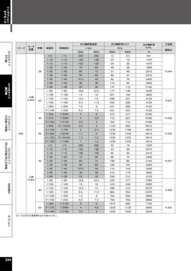 インダクションギアモータG/G3タイプ平行軸H/H2タイプ直交軸F/FAタイプ中空軸・中実軸F2/F3タイプ同心中空軸・同心中実軸技術資料オプション50Hz30015010075605037.5302518.81512.59.47.56.3543.32.521.71.3130015010075605037.5302518.81512.59.47.56.3543.360Hz36018012090726045363022.5181511.297.564.8432.421.51.236018012090726045363022.5181511.297.564.8450Hz12233446576992115137177221266355431431572715764115012301230123012302243658610812817221525833241649866476476410701230123060Hz9.5192838485776951151481842212953694314775977159551190123012301230183654728910714317921527734641555469276489511201230N9311470167018602010221024502650274034303820412041204120412067606760676095109510951095109510152020102210245027402940343038204120578060806270647066606660774080408530寸法図脚取付P.244P.247P.250P.252P.247P.250P.252シリーズモータ容量枠番減速比実減速比r/minN・m出力軸回転速度出力軸許容トルク出力軸許容O.H.L.1/51/101/151/201/251/301/401/501/601/801/1001/1201/1601/200※1/2401/3001/375※1/4501/600※1/750※1/900※1/1200※1/15001/51/101/151/201/251/301/401/501/601/801/1001/1201/160※1/200※1/2401/300※1/375※1/4501/51/101/151/201/251/301/401/501/591/801/1001/1201/1601/2001/2367/20807/26007/312021/122201/7287/624021/244401/14561/51/101/151/201/251/301/401/501/591/801/1001/1201/1601/2001/2407/21207/26507/318028三相0.4kW32MID三相0.75kW4050324050注1.P.233の注意事項を必ずお読みください。234