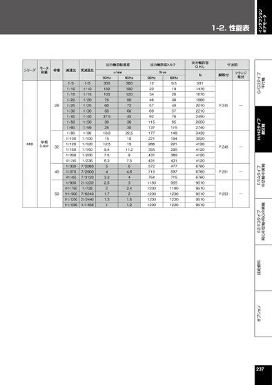 1-2.性能表インダクションギアモータオプション技術資料F2/F3タイプ同心中空軸・同心中実軸F/FAタイプ中空軸・中実軸H/H2タイプ直交軸G/G3タイプ平行軸シリーズモータ容量枠番減速比実減速比出力軸回転速度出力軸許容トルクr/minN・mMID単相0.4kW1/51/101/151/201/251/301/401/501/601/801/1001/1201/1601/200※1/2401/3001/375※1/4501/600※1/750※1/900※1/1200※1/15001/51/101/151/201/251/301/401/501/591/801/1001/1201/1601/2001/2367/20807/26007/312021/122201/7287/624021/244401/14562832405050Hz30015010075605037.5302518.81512.59.47.56.3543.32.521.71.3160Hz36018012090726045363022.5181511.297.564.8432.421.51.250Hz122334465769921151371772212663554314315727157641150123012301230123060Hz9.5192838485776951151481842212953694314775977159551190123012301230寸法図脚取付フランジ取付P.245―P.248―P.251―P.253―出力軸許容O.H.L.N9311470167018602010221024502650274034303820412041204120412067606760676095109510951095109510237