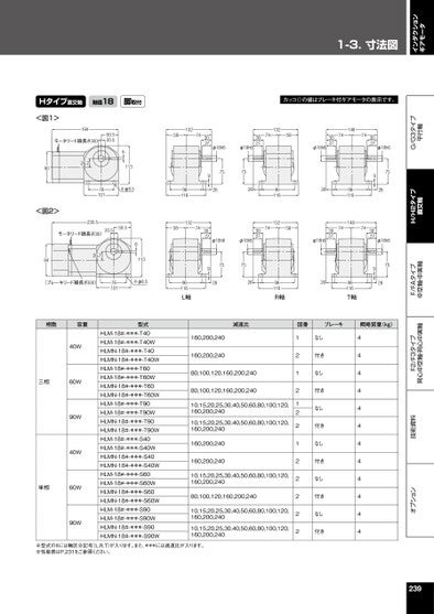1-3.⼨法図インダクションギアモータオプション技術資料F2/F3タイプ同心中空軸・同心中実軸F/FAタイプ中空軸・中実軸H/H2タイプ直交軸G/G3タイプ平行軸Hタイプ直交軸軸径18脚取付<図1>194モータリード線長さ30050.520.59025.761134-φ8.576101<図2>230.5モータリード線長さ30050.520.59425.7(ブレーキリード線長さ300)7610161134-φ8.5相数容量40W三相60W90W40W単相60W90W型式HLM-18#-***-T40HLM-18#-***-T40WHLMN-18#-***-T40HLMN-18#-***-T40WHLM-18#-***-T60HLM-18#-***-T60WHLMN-18#-***-T60HLMN-18#-***-T60WHLM-18#-***-T90HLM-18#-***-T90WHLMN-18#-***-T90HLMN-18#-***-T90WHLM-18#-***-S40HLM-18#-***-S40WHLMN-18#-***-S40HLMN-18#-***-S40WHLM-18#-***-S60HLM-18#-***-S60WHLMN-18#-***-S60HLMN-18#-***-S60WHLM-18#-***-S90HLM-18#-***-S90WHLMN-18#-***-S90HLMN-18#-***-S90Wカッコ()の値はブレーキ付ギアモータの表示です。1327458302713274583027148743027φ18h6743027φ18h6φ18h6φ18h675759269611626961162696116759261327458302713274583027148743027φ18h6743027φ18h6φ18h6φ18h6757592696116L軸2696116R軸2696116T軸75926減速比図番ブレーキ概略質量(kg)160,200,240160,200,24080,100,120,160,200,24080,100,120,160,200,24010,15,20,25,30,40,50,60,80,100,120,160,200,24010,15,20,25,30,40,50,60,80,100,120,160,200,240160,200,240160,200,24010,15,20,25,30,40,50,60,80,100,120,160,200,24080,100,120,160,200,24010,15,20,25,30,40,50,60,80,100,120,160,200,24010,15,20,25,30,40,50,60,80,100,120,160,200,2401212122122222なし付きなし付きなし付きなし付きなし付きなし付き444444444444※型式の#には軸区分記号(L,R,T)が入ります。また、***には減速比が入ります。※性能表はP.231をご参照ください。239