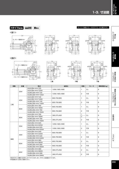 1-3.⼨法図インダクションギアモータオプション技術資料F2/F3タイプ同心中空軸・同心中実軸F/FAタイプ中空軸・中実軸H/H2タイプ直交軸G/G3タイプ平行軸カッコ()の値はブレーキ付ギアモータの表示です。Hタイプ直交軸軸径28脚取付<図1>339モータリード線長さ30062.5319013498174.54-φ1180125<図2>375.5モータリード線長さ30062.5319413498174.5(ブレーキリード線長さ300)4-φ118012516464100φ1821001264540155016464100φ182100126L軸φ18210012616410064φ28h6φ28h61201204540155045401550φ28h6φ28h6120120454015501641006420010045401004540φ28h6φ28h6120φ18215505010012620010045401004540φ28h6φ28h6120φ182φ182100126R軸155050100126T軸相数容量三相単相25W40W60W90W25W40W60W90W型式HLM-28#-***-T25HLM-28#-***-T25WHLMN-28#-***-T25HLMN-28#-***-T25WHLM-28#-***-T40HLM-28#-***-T40WHLMN-28#-***-T40HLMN-28#-***-T40WHLM-28#-***-T60HLM-28#-***-T60WHLMN-28#-***-T60HLMN-28#-***-T60WHLM-28#-***-T90HLM-28#-***-T90WHLMN-28#-***-T90HLMN-28#-***-T90WHLM-28#-***-S25HLM-28#-***-S25WHLMN-28#-***-S25HLMN-28#-***-S25WHLM-28#-***-S40HLM-28#-***-S40WHLMN-28#-***-S40HLMN-28#-***-S40WHLM-28#-***-S60HLM-28#-***-S60WHLMN-28#-***-S60HLMN-28#-***-S60WHLM-28#-***-S90HLM-28#-***-S90WHLMN-28#-***-S90HLMN-28#-***-S90W減速比図番ブレーキ概略質量(kg)1200,1500,18001200,1500,1800600,750,900600,750,900600,750,900600,750,900300,375,450300,375,4501200,1500,18001200,1500,1800600,750,900600,750,900600,750,900600,750,900300,375,450300,375,45012121212212122222なし付きなし付きなし付きなし付きなし付きなし付きなし付きなし付き9999999999999999※型式の#には軸区分記号(L,R,T)が入ります。また、***には減速比が入ります。※性能表はP.230をご参照ください。243