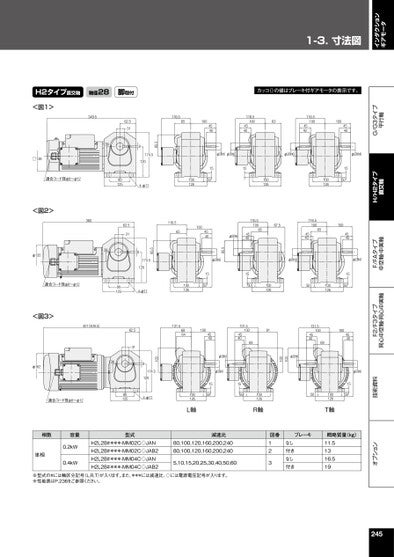 1-3.⼨法図インダクションギアモータオプション技術資料F2/F3タイプ同心中空軸・同心中実軸F/FAタイプ中空軸・中実軸H/H2タイプ直交軸G/G3タイプ平行軸1001268115501004540φ28h61550H2タイプ直交軸軸径28脚取付<図1>カッコ()の値はブレーキ付ギアモータの表示です。349.562.531116.5651004540116.5100454063116.510045401004540φ28h6φ28h6φ28h6φ28h6155010012615100126155010012685.58174.5120801254-φ11φ28h6φ28h685.5φ28h685.58174.512062.531116.5651004540116.51006567.5φ28h64540116.51006545401004540□126適合コード径φ8~φ12<図2>360φ1353939適合コード径φ8~φ12801254-φ111550100126155050100126131.5100131.510069100126T軸454050φ28h610310369100126R軸φ28h6φ28h645401550131.5696410045401550100126L軸1038174.512062.531<図3>401(409.5)φ16236適合コード径φ8~φ12801254-φ11相数容量型式単相0.2kW0.4kWH2L28#***-MM02C◇JANH2L28#***-MM02C◇JAB2H2L28#***-MM04C◇JANH2L28#***-MM04C◇JAB2減速比80,100,120,160,200,24080,100,120,160,200,2405,10,15,20,25,30,40,50,60※型式の#には軸区分記号(L,R,T)が入ります。また、***には減速比、◇には電源電圧記号が入ります。※性能表はP.236をご参照ください。図番123ブレーキ概略質量(kg)なし付きなし付き11.51316.519245
