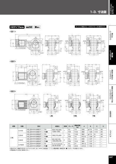 1-3.⼨法図インダクションギアモータオプション技術資料F2/F3タイプ同心中空軸・同心中実軸F/FAタイプ中空軸・中実軸H/H2タイプ直交軸G/G3タイプ平行軸H2タイプ直交軸軸径32脚取付カッコ()の値はブレーキ付ギアモータの表示です。(A)ACDケーブル引込口φ273595152102054-φ131101205550φ32h6φ32h675120110555012011055501205550φ32h6181401812015060601201506012015060φ32h614018<図1>B(B)<図2>176102A37.5887611712055501201175550751201201175550φ32h6φ32h6φ32h6140140186012015060120150φ32h614055501860B45205ケーブル引込口φ27951524-φ13120150<図3>(A)A35128B42205ケーブル引込口φ27951524-φ13120150L軸18601205550186012812055508012812055501205550φ32h6φ32h6φ32h614014060120150R軸60120150T軸φ32h61401860相数容量型式減速比図番ブレーキ概略質量(kg)AB三相0.1kW0.2kW0.4kW0.75kWH2L32#***-MM01T◇◇TNH2L32#***-MM01T◇◇TB◆H2L32#***-MM02T◇◇TNH2L32#***-MM02T◇◇TB◆H2L32#***-MM04T◇◇TNH2L32#***-MM04T◇◇TB◆H2L32#***-MR08T◇◇TNH2L32#***-MR08T◇◇TB◆600,750,900,1200,1500300,375,45080,100,120,160,200,2405,10,15,20,25,30,40,50,601123なし付きなし付きなし付きなし付き1314.513.5151415.52123.5328368362412.5340360391.5410.5φ115□126φ115□126□137□137□154□154C17.517.588――――D45454242――――※型式の#には軸区分記号(L,R,T)が入ります。また、***には減速比、◇◇には電源電圧・規格記号、◆にはブレーキ仕様が入ります。※性能表はP.233をご参照ください。247
