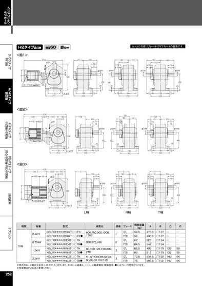 インダクションギアモータG/G3タイプ平行軸H/H2タイプ直交軸F/FAタイプ中空軸・中実軸F2/F3タイプ同心中空軸・同心中実軸技術資料オプションH2タイプ直交軸軸径50脚取付<図1>(A)Aφ2053.5B2365ケーブル引込口φ2714308カッコ()の値はブレーキ付ギアモータの表示です。11716575701651171157570φ50h6φ50h6φ50h6165117757016575702002002525φ50h6200251502104-φ1818023075751802307518023075128165757012816587757012816575701657570φ50h6φ50h6φ50h62002002575257518023075180230φ50h620025751502104-φ18180230<図2>(A)A70.523610268.5130.5φ2010553.51465308Bケーブル引込口φ27<図3>(A)A281.510291130.5φ2010553.5B65308ケーブル引込口φ271502104-φ18C1657570C1657570DC16575701657570φ50h6φ50h6φ50h62575180230L軸2002002575180230R軸75180230T軸φ50h62002575C――――139139149149D――――89899696相数容量型式減速比図番ブレーキ概略質量(kg)AB三相0.4kW0.75kW1.5kW2.2kWH2L50#***-MM04T◇◇TNH2L50#***-MM04T◇◇TB◆H2L50#***-MR08T◇◇TNH2L50#***-MR08T◇◇TB◆H2L50#***-MR15T◇◇TNH2L50#***-MR15T◇◇TB◆H2L50#***-MR22T◇◇TNH2L50#***-MR22T◇◇TB◆600,750,900,1200,1500300,375,45080,100,120,160,200,2405,10,15,20,25,30,40,50,60,80,100,1201233なし付きなし付きなし付きなし付き54.5566264.565.56972.576470.5490.5523542488517537.5566.5□137□137□154□154□178□178□192□192※型式の#には軸区分記号(L,R,T)が入ります。また、***には減速比、◇◇には電源電圧・規格記号、◆にはブレーキ仕様が入ります。※性能表はP.234をご参照ください。252