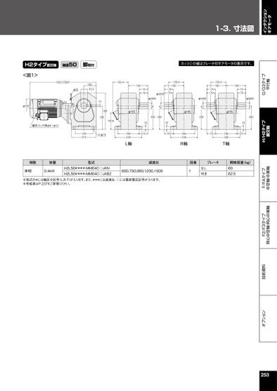 1-3.⼨法図インダクションギアモータオプション技術資料F2/F3タイプ同心中空軸・同心中実軸F/FAタイプ中空軸・中実軸H/H2タイプ直交軸G/G3タイプ平行軸H2タイプ直交軸軸径50脚取付<図1>550.5(559)10553.5φ20130.4φ1622365適合コード径φ8~φ1214308200140.61502104-φ18180230L軸1657570φ50h6φ50h6130.41657570φ50h6130.416575701657570φ165φ165φ16520020020025752575180230R軸75180230T軸カッコ()の値はブレーキ付ギアモータの表示です。φ50h62002575相数容量単相0.4kW型式H2L50#***-MM04C◇JANH2L50#***-MM04C◇JAB2減速比図番ブレーキ概略質量(kg)600,750,900,1200,15001なし付き6062.5※型式の#には軸区分記号(L,R,T)が入ります。また、***には減速比、◇には電源電圧記号が入ります。※性能表はP.237をご参照ください。253