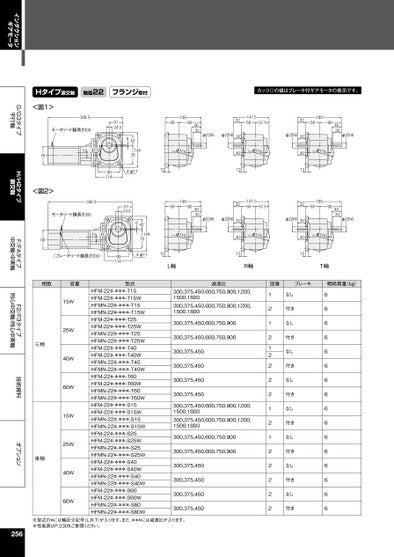 インダクションギアモータG/G3タイプ平行軸H/H2タイプ直交軸F/FAタイプ中空軸・中実軸F2/F3タイプ同心中空軸・同心中実軸技術資料オプションHタイプ直交軸軸径22フランジ取付カッコ()の値はブレーキ付ギアモータの表示です。<図1>308.5モータリード線長さ3005724.5761141.5642144784-φ11129011414890584035φ115φ22h6φ22h6<図2>346.5モータリード線長さ3005724.514890584035φ115φ22h6φ22h664214478801141.5(ブレーキリード線長さ300)4-φ111290114L軸3235401232354012147.55857.5φ115147.55857.5φ115R軸φ22h6φ22h6323540123235401218058904035φ22h6φ11518058904035φ22h6φ115T軸相数容量三相単相15W25W40W60W15W25W40W60W型式HFM-22#-***-T15HFM-22#-***-T15WHFMN-22#-***-T15HFMN-22#-***-T15WHFM-22#-***-T25HFM-22#-***-T25WHFMN-22#-***-T25HFMN-22#-***-T25WHFM-22#-***-T40HFM-22#-***-T40WHFMN-22#-***-T40HFMN-22#-***-T40WHFM-22#-***-T60HFM-22#-***-T60WHFMN-22#-***-T60HFMN-22#-***-T60WHFM-22#-***-S15HFM-22#-***-S15WHFMN-22#-***-S15HFMN-22#-***-S15WHFM-22#-***-S25HFM-22#-***-S25WHFMN-22#-***-S25HFMN-22#-***-S25WHFM-22#-***-S40HFM-22#-***-S40WHFMN-22#-***-S40HFMN-22#-***-S40WHFM-22#-***-S60HFM-22#-***-S60WHFMN-22#-***-S60HFMN-22#-***-S60W減速比図番ブレーキ概略質量(kg)300,375,450,600,750,900,1200,1500,1800300,375,450,600,750,900,1200,1500,1800300,375,450,600,750,900300,375,450,600,750,900300,375,450300,375,450300,375,450300,375,450300,375,450,600,750,900,1200,1500,1800300,375,450,600,750,900,1200,1500,1800300,375,450,600,750,900300,375,450,600,750,900300,375,450300,375,450300,375,450300,375,45012121222212122222なし付きなし付きなし付きなし付きなし付きなし付きなし付きなし付き6666666666666666※型式の#には軸区分記号(L,R,T)が入ります。また、***には減速比が入ります。※性能表はP.230をご参照ください。256