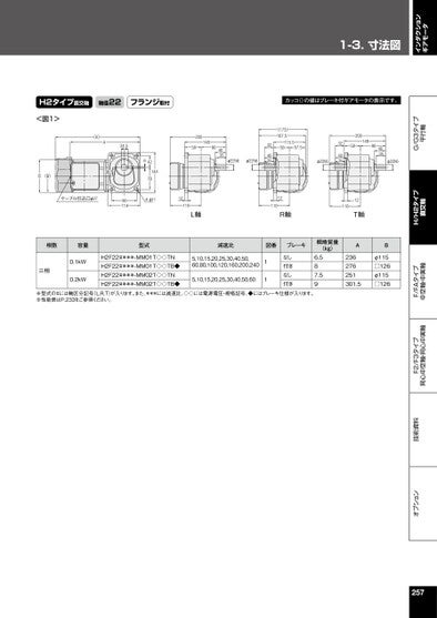 1-3.⼨法図インダクションギアモータオプション技術資料F2/F3タイプ同心中空軸・同心中実軸F/FAタイプ中空軸・中実軸H/H2タイプ直交軸G/G3タイプ平行軸H2タイプ直交軸軸径22フランジ取付カッコ()の値はブレーキ付ギアモータの表示です。<図1>(A)A24.5B(B)30.5ケーブル引込口φ2790114642144784-φ1120014890584035φ22h6φ22h6(173)167.5115.55857.5324035324035φ22h620014858904035φ22h612110L軸12110R軸11012T軸相数容量型式減速比図番ブレーキ三相0.1kW0.2kWH2F22#***-MM01T◇◇TNH2F22#***-MM01T◇◇TB◆H2F22#***-MM02T◇◇TNH2F22#***-MM02T◇◇TB◆5,10,15,20,25,30,40,50,60,80,100,120,160,200,2405,10,15,20,25,30,40,50,6011なし付きなし付き概略質量(kg)6.587.59A236276251301.5Bφ115□126φ115□126※型式の#には軸区分記号(L,R,T)が入ります。また、***には減速比、◇◇には電源電圧・規格記号、◆にはブレーキ仕様が入ります。※性能表はP.233をご参照ください。257
