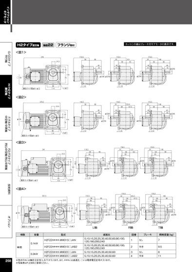 インダクションギアモータG/G3タイプ平行軸H/H2タイプ直交軸F/FAタイプ中空軸・中実軸F2/F3タイプ同心中空軸・同心中実軸技術資料オプションH2タイプ直交軸軸径22フランジ取付カッコ()の値はブレーキ付ギアモータの表示です。<図1>□12627624.5116.5589030.5642144781216358116.532403540351485890116.53240354035φ22h6φ22h6φ22h6φ22h6適合コード径φ8~φ12901144-φ11121212<図2>278.524.5116.55890φ13530.5適合コード径φ8~φ12<図3>64214478901144-φ11125.567.558116.53240351485890116.53240354035φ22h6φ22h64035φ22h6φ22h612121214890116.532586540354035φ22h6φ22h685.512163116.53258654035φ22h685.5φ22h690403534124.5116.5586585.56421447830.5□126適合コード径φ8~φ12901144-φ111212124035φ22h614890116.53258654035φ22h685.5125.567.5116.53258654035φ22h685.5904035φ22h6351.524.5116.5586585.56421447830.5<図4>φ135適合コード径φ8~φ12901144-φ1112L軸12R軸12T軸相数容量型式減速比図番ブレーキ概略質量(kg)単相0.1kW0.2kWH2F22#***-MM01S◇JANH2F22#***-MM01S◇JAB2H2F22#***-MM02C◇JANH2F22#***-MM02C◇JAB25,10,15,20,25,30,40,50,60,80,100,120,160,200,2405,10,15,20,25,30,40,50,60,80,100,120,160,200,2405,10,15,20,25,30,40,50,605,10,15,20,25,30,40,50,601234なし付きなし付き79.5811258※型式の#には軸区分記号(L,R,T)が入ります。また、***には減速比、◇には電源電圧記号が入ります。※性能表はP.236をご参照ください。