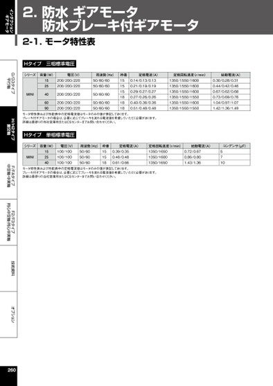 インダクションギアモータG/G3タイプ平行軸H/H2タイプ直交軸F/FAタイプ中空軸・中実軸F2/F3タイプ同心中空軸・同心中実軸技術資料オプション2.防水ギアモータ防水ブレーキ付ギアモータ2-1.モータ特性表Hタイプ三相標準電圧シリーズ容量(W)電圧(V)周波数(Hz)MINI1525406090200/200/220200/200/220200/200/220200/200/220200/200/22050/60/6050/60/6050/60/6050/60/6050/60/60枠番151515181818定格電流(A)定格回転速度(r/min)始動電流(A)0.14/0.13/0.130.21/0.19/0.190.29/0.27/0.270.27/0.26/0.260.40/0.36/0.360.51/0.48/0.481350/1550/16001350/1550/16001350/1550/16001350/1550/15501350/1550/16001350/1550/15500.30/0.28/0.310.44/0.42/0.460.67/0.62/0.680.73/0.69/0.761.04/0.97/1.071.42/1.36/1.49モータ特性表および性能表中の定格電流値はモータのみの値が表記してあります。ブレーキ付ギアモータの場合は、必要に応じてブレーキを流れる電流値を考慮していただく必要があります。詳細は最寄りの当社営業所またはCSセンターまでお問い合わせください。Hタイプ単相標準電圧シリーズ容量(W)電圧(V)MINI152540100/100100/100100/100周波数(Hz)50/6050/6050/60枠番151518定格電流(A)0.39/0.350.48/0.480.61/0.66定格回転速度(r/min)1350/16501350/16001350/1650始動電流(A)コンデンサ(μF)0.72/0.670.86/0.801.43/1.365710モータ特性表および性能表中の定格電流値はモータのみの値が表記してあります。ブレーキ付ギアモータの場合は、必要に応じてブレーキを流れる電流値を考慮していただく必要があります。詳細は最寄りの当社営業所またはCSセンターまでお問い合わせください。260
