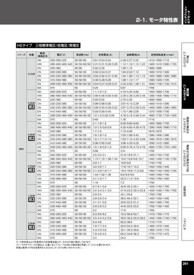 インダクションギアモータ2-1.モータ特性表オプション技術資料F2/F3タイプ同心中空軸・同心中実軸F/FAタイプ中空軸・中実軸H/H2タイプ直交軸G/G3タイプ平行軸H2タイプ三相標準電圧/倍電圧/異電圧シリーズ容量MID0.1kW0.2kW0.4kW0.75kW1.5kW2.2kW電源・規格記号NNWNKNCNDNENANMANNWNKNCNDNENANMANNWNKNCNDNENANMANNWNKNCNDNENUNMANNWNKNCNENUNMANNWNKNCNENUNMA電圧(V)周波数(Hz)定格電流(A)始動電流(A)定格回転速度(r/min)200/200/220380/400/400/440220/380220/230/380220/220/380/380415/440/480208/230/460/400575200/200/220380/400/400/440220/380220/230/380220/220/380/380415/440/480208/230/460/400575200/200/220380/400/400/440220/380220/230/380220/220/380/380415/440/480208/230/460/400575200/200/220380/400/400/440220/380220/230/380220/220/380/380415/440/480230/460/400575200/200/220380/400/400/440220/380220/230/380415/440/480230/460/400575200/200/220380/400/400/440220/380220/230/380415/440/480230/460/40057550/60/6050/50/60/6060/6050/50/5050/60/50/6050/50/6060/60/60/506050/60/6050/50/60/6060/6050/50/5050/60/50/6050/50/6060/60/60/506050/60/6050/50/60/6060/6050/50/5050/60/50/6050/50/6060/60/60/506050/60/6050/50/60/6060/6050/50/5050/60/50/6050/50/6060/60/506050/60/6050/50/60/6060/6050/50/5050/50/6060/60/506050/60/6050/50/60/6060/6050/50/5050/50/6060/60/50600.61/0.54/0.540.31/0.31/0.28/0.280.52/0.300.55/0.54/0.310.55/0.52/0.31/0.300.30/0.29/0.260.54/0.57/0.29/0.310.201.1/1.0/1.00.56/0.56/0.50/0.500.93/0.520.99/0.98/0.560.99/0.93/0.56/0.520.50/0.50/0.451.0/1.0/0.50/0.560.402.1/1.8/1.81.0/1.0/0.9/0.91.7/1.01.8/1.8/1.01.8/1.7/1.0/1.00.96/0.95/0.821.8/1.8/0.9/1.00.683.5/3.2/3.11.73/1.72/1.58/1.542.9/1.73.0/3.0/1.73.1/2.9/1.8/1.71.54/1.52/1.363.1/1.5/1.71.166.7/6.1/5.93.4/3.4/3.1/3.05.9/3.45.9/5.9/3.43.1/3.1/2.85.9/2.9/3.32.29.3/8.6/8.24.5/4.4/4.2/3.98.3/4.87.9/7.7/4.54.3/4.3/3.87.9/4.0/4.53.32.39/2.27/2.521.12/1.18/1.12/1.221.90/1.101.94/2.03/1.121.94/1.90/1.12/1.101.06/1.12/1.172.35/2.62/1.26/1.210.874.70/4.35/4.852.29/2.38/2.29/2.483.70/2.203.97/4.15/2.293.97/3.70/2.29/2.201.75/1.86/2.004.78/5.16/2.56/2.441.789.50/8.60/9.604.35/4.65/4.30/4.757.10/4.097.63/7.88/4.437.63/7.10/4.43/4.093.96/4.20/4.208.90/9.76/4.73/4.783.5121.8/19.0/21.110.2/10.8/9.8/10.716.9/9.817.8/18.7/10.319.3/16.9/11.2/9.88.6/9.3/9.022.3/11.2/10.87.245.6/40.3/45.121.9/23.2/20.4/22.845.1/25.838.5/40.4/22.120.8/22.2/21.244.9/22.6/23.217.070.3/56.9/63.730.0/32.0/25.0/28.065.0/38.052.0/54.3/30.033.1/35.5/29.865.2/34.8/36.324.41410/1690/17101400/1410/1690/17201680/16801400/1410/14001400/1680/1400/16801390/1420/17201690/1730/1730/141017001400/1680/17001390/1400/1680/17101680/16801400/1410/13901400/1680/1390/16801370/1400/17001680/1720/1720/140017101400/1680/17001390/1400/1680/17101670/16701390/1400/13901390/1670/1390/16701390/1410/16801680/1720/1720/140017001450/1740/17501440/1450/1740/17501740/17401450/1450/14401450/1740/1450/17401440/1450/17501760/1760/145017501450/1740/17601450/1450/1750/17601760/17601450/1450/14501450/1460/17601760/1760/145017601470/1760/17701440/1450/1740/17501770/17701460/1470/14401460/1470/17701770/1770/14701760モータ特性表および性能表中の定格電流値はモータのみの値が表記してあります。ブレーキ付ギアモータの場合は、必要に応じてブレーキを流れる電流値を考慮していただく必要があります。詳細は最寄りの当社営業所またはCSセンターまでお問い合わせください。261