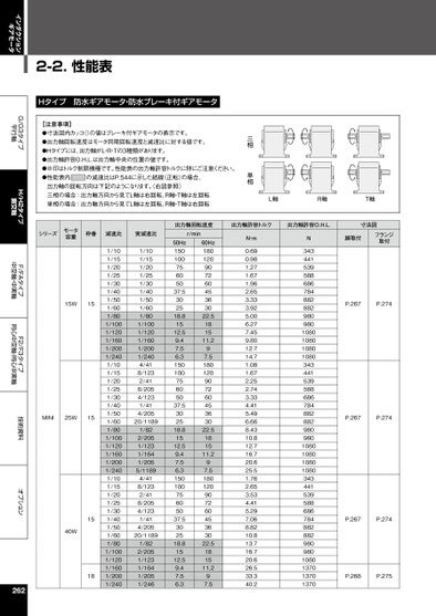 インダクションギアモータG/G3タイプ平行軸H/H2タイプ直交軸F/FAタイプ中空軸・中実軸F2/F3タイプ同心中空軸・同心中実軸技術資料オプション出力軸回転速度出力軸許容トルク出力軸許容O.H.L.寸法図L軸R軸T軸三相単相●寸法図内カッコ()の値はブレーキ付ギアモータの表示です。●出力軸回転速度はモータ同期回転速度と減速比に対する値です。●Hタイプには、出力軸がL・R・Tの3種類があります。●出力軸許容O.H.L.は出力軸中央の位置の値です。●※印はトルク制限機種です。性能表の出力軸許容トルクに特にご注意ください。●性能表内の減速比はP.544に示した結線(正転)の場合、出力軸の回転方向は下記のようになります。右図参照)三相の場合:出力軸方向から見てL軸は右回転、R軸・T軸は左回転単相の場合:出力軸方向から見てL軸は左回転、R軸・T軸は右回転【注意事項】Hタイプ防水ギアモータ・防水ブレーキ付ギアモータ2-2.性能表シリーズモータ容量枠番減速比実減速比r/min1/101/151/201/251/301/401/501/601/801/1001/1201/1601/2001/2401/101/151/201/251/301/401/501/601/801/1001/1201/1601/2001/2401/101/151/201/251/301/401/501/601/801/1001/1201/1601/2001/2401/101/151/201/251/301/401/501/601/801/1001/1201/1601/2001/2404/418/1232/418/2054/1231/414/20520/11891/822/2051/1231/1641/2055/11894/418/1232/418/2054/1231/414/20520/11891/822/2051/1231/1641/2051/24650Hz15010075605037.5302518.81512.59.47.56.315010075605037.5302518.81512.59.47.56.315010075605037.5302518.81512.59.47.56.360Hz18012090726045363022.5181511.297.518012090726045363022.5181511.297.518012090726045363022.5181511.297.515W15MINI25W1540W1518262N・m0.690.981.271.671.962.653.333.925.006.277.459.8012.714.71.081.672.252.743.334.415.496.668.4310.812.716.720.625.51.762.653.534.415.297.068.8210.813.716.720.626.533.340.2N343441539588686784882882980980108010801080108034344153958868678488288298098010801080108010803434415395886867848828829809801080137013701370脚取付フランジ取付P.267P.274P.267P.274P.267P.274P.268P.275