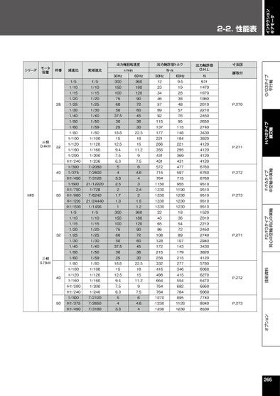 インダクションギアモータ2-2.性能表オプション技術資料F2/F3タイプ同心中空軸・同心中実軸F/FAタイプ中空軸・中実軸H/H2タイプ直交軸G/G3タイプ平行軸シリーズモータ容量枠番減速比実減速比r/minN・m出力軸回転速度出力軸許容トルク出力軸許容O.H.L.1/51/101/151/201/251/301/401/501/601/801/1001/1201/1601/200※1/2401/3001/375※1/4501/600※1/750※1/900※1/1200※1/15001/51/101/151/201/251/301/401/501/601/801/1001/1201/160※1/200※1/2401/300※1/375※1/4501/51/101/151/201/251/301/401/501/591/801/1001/1201/1601/2001/2367/20807/26007/312021/122201/7287/624021/244401/14561/51/101/151/201/251/301/401/501/591/801/1001/1201/1601/2001/2407/21207/26507/318028三相0.4kW32MID三相0.75kW405032405050Hz30015010075605037.5302518.81512.59.47.56.3543.32.521.71.3130015010075605037.5302518.81512.59.47.56.3543.360Hz36018012090726045363022.5181511.297.564.8432.421.51.236018012090726045363022.5181511.297.564.8450Hz12233446576992115137177221266355431431572715764115012301230123012302243658610812817221525833241649866476476410701230123060Hz9.5192838485776951151481842212953694314775977159551190123012301230183654728910714317921527734641555469276489511201230N9311470167018602010221024502650274034303820412041204120412067606760676095109510951095109510152020102210245027402940343038204120578060806270647066606660774080408530寸法図脚取付P.270P.271P.272P.273P.271P.272P.273265