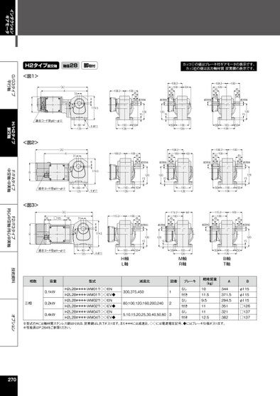インダクションギアモータG/G3タイプ平行軸H/H2タイプ直交軸F/FAタイプ中空軸・中実軸F2/F3タイプ同心中空軸・同心中実軸技術資料オプションH2タイプ直交軸軸径28脚取付カッコ()の値はブレーキ付ギアモータの表示です。カッコ[]の値は出力軸材質炭素鋼の表示です。<図1>B(A)A318.5368174.5108.21004536[40]φ28h612015φ28h612015108.21004536[40]64108.21004536[40]1004536[40]φ28h6φ28h612015適合コード径φ8~φ12801254-φ1110012650501001265010012650<図2>B(A)A31398174.5108.21004536[40]φ28h6φ28h6108.21004536[40]63108.21004536[40]φ28h61004536[40]φ28h6120151201512015適合コード径φ8~φ12801254-φ11100126501001265010012650<図3>(A)35□105A3831115.2100B368174.5適合コード径φ8~φ12801254-φ11100126H軸L軸φ28h6φ28h612015120154536[40]5064115.21004536[40]115.21004536[40]φ28h61004536[40]φ28h61201550100126M軸R軸5050100126B軸T軸相数容量型式減速比図番ブレーキ0.1kW三相0.2kW0.4kWH2L28#***-WM01T◇◇ENH2L28#***-WM01T◇◇EV◆H2L28#***-WM02T◇◇ENH2L28#***-WM02T◇◇EV◆H2L28#***-WM04T◇◇ENH2L28#***-WM04T◇◇EV◆300,375,45080,100,120,160,200,2405,10,15,20,25,30,40,50,60123なし付きなし付きなし付き概略質量(kg)1011.59.5111112.5A344371.5294.5351321382Bφ115φ115φ115□126□137□137※型式の#には軸材質ステンレス鋼はH,M,B、炭素鋼はL,R,Tが入ります。また***には減速比、◇◇には電源電圧記号、◆にはブレーキ仕様が入ります。※性能表はP.264をご参照ください。270