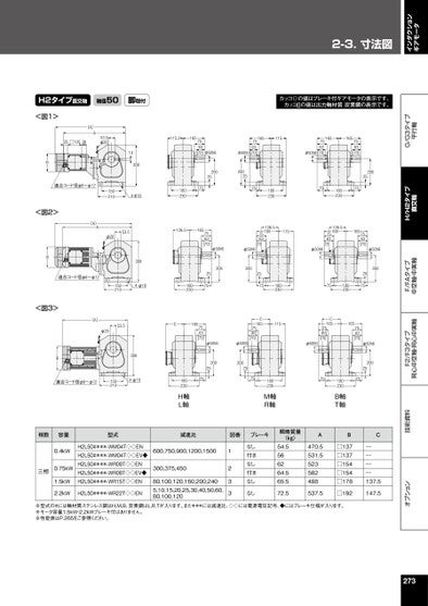インダクションギアモータ2-3.寸法図オプション技術資料F2/F3タイプ同心中空軸・同心中実軸F/FAタイプ中空軸・中実軸H/H2タイプ直交軸G/G3タイプ平行軸H2タイプ直交軸軸径50脚取付<図1>(A)A35□1053853.5φ20B236514308カッコ()の値はブレーキ付ギアモータの表示です。カッコ[]の値は出力軸材質炭素鋼の表示です。115.21657563[70]φ50h67563[70]φ50h61651157563[70]φ50h61651657563[70]適合コード径φ8~φ121502104-φ1875180230751802307518023075200252002520025126.5165115126.51657563[70]1657563[70]φ50h6φ50h6200257575180230<図2>(A)A53.5φ20126.51657563[70]B1465308適合コード径φ8~φ121502104-φ182575180230φ50h6φ50h62002007563[0]2575<図3>(A)53.5φ20C1657563[70]φ50h6φ50h6C1657563[70]B65308適合コード径φ8~φ124-φ1815021020025200257575180230H軸L軸180230115C1657563[70]φ50h61657563[70]φ50h620025180230M軸R軸7575180230B軸T軸相数容量型式減速比図番ブレーキ三相0.4kW0.75kW1.5kWH2L50#***-WM04T◇◇ENH2L50#***-WM04T◇◇EV◆H2L50#***-WR08T◇◇ENH2L50#***-WR08T◇◇EV◆H2L50#***-WR15T◇◇EN2.2kWH2L50#***-WR22T◇◇EN600,750,900,1200,1500300,375,45080,100,120,160,200,2405,10,15,20,25,30,40,50,60,80,100,1201233なし付きなし付きなしなし概略質量(kg)54.5566264.565.572.5A470.5531.5523582488537.5B□137□137□154□154□178□192C――――137.5147.5※型式の#には軸材質ステンレス鋼はH,M,B、炭素鋼はL,R,Tが入ります。また***には減速比、◇◇には電源電圧記号、◆にはブレーキ仕様が入ります。※モータ容量1.5kW・2.2kWブレーキ付はありません。※性能表はP.265をご参照ください。273