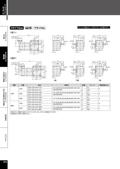 インダクションギアモータG/G3タイプ平行軸H/H2タイプ直交軸F/FAタイプ中空軸・中実軸F2/F3タイプ同心中空軸・同心中実軸技術資料オプションHタイプ直交軸軸径15フランジ取付カッコ()の値はブレーキ付ギアモータの表示です。<図1>キャブタイヤケーブルφ7.62000mm34599.5<図2>19242.5174010446642721.57622.3530102564-φ6.5648524102403846φ15h6φ15h621.527φ15h621.527241284640642721.5φ15h6999キャブタイヤケーブルφ7.72000mm223421442.51759φ61.57622.3530102564-φ6.56485相数容量三相単相15W25W40W15W25W型式HFW-15#-***-T15HFV-15#-***-T15HFW-15#-***-T25HFV-15#-***-T25HFW-15#-***-T40HFV-15#-***-T40HFW-15#-***-S15HFV-15#-***-S15HFW-15#-***-S25HFV-15#-***-S254010446642721.5φ15h6φ15h6241024038469L軸21.5279R軸減速比10,15,20,25,30,40,50,60,80,100,120,160,200,24010,15,20,25,30,40,50,60,80,100,120,160,200,24010,15,20,25,30,40,50,60,80,100,12010,15,20,25,30,40,50,60,80,100,120,160,200,24010,15,20,25,30,40,50,60,80,100,120,160,200,240図番1212121212241284640642721.5φ15h6φ15h621.5279T軸ブレーキ概略質量(kg)なし付きなし付きなし付きなし付きなし付き33333※型式の#には軸区分記号(L,R,T)が入ります。また、***には減速比が入ります。※性能表はP.262をご参照ください。274