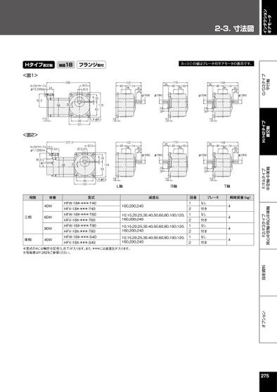 インダクションギアモータ2-3.寸法図オプション技術資料F2/F3タイプ同心中空軸・同心中実軸F/FAタイプ中空軸・中実軸H/H2タイプ直交軸G/G3タイプ平行軸Hタイプ直交軸軸径18フランジ取付カッコ()の値はブレーキ付ギアモータの表示です。<図1>キャブタイヤケーブルφ7.62000mm3420850.520.548122467430249025.7635118654-φ8.5108010165.57.5<図2>キャブタイヤケーブルφ7.72000mm23.534231.550.520.5481224674302465.5φ779025.763511865801014-φ8.510L軸2611948454626148464874φ18h6φ18h6φ18h63024φ18h62430102430102611948454626148464874φ18h6φ18h6φ18h63024φ18h6243010R軸243010T軸相数容量40W60W90W40W三相単相型式HFW-18#-***-T40HFV-18#-***-T40HFW-18#-***-T60HFV-18#-***-T60HFW-18#-***-T90HFV-18#-***-T90HFW-18#-***-S40HFV-18#-***-S40減速比160,200,24010,15,20,25,30,40,50,60,80,100,120,160,200,24010,15,20,25,30,40,50,60,80,100,120,160,200,24010,15,20,25,30,40,50,60,80,100,120,160,200,240図番12121212ブレーキ概略質量(kg)なし付きなし付きなし付きなし付き4444※型式の#には軸区分記号(L,R,T)が入ります。また、***には減速比が入ります。※性能表はP.262をご参照ください。275